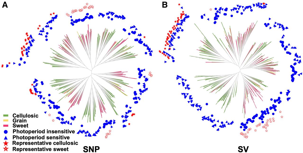 Phylogenetic trees of 339 sorghum lines in the BAP. Phylogenetic trees were conducted using SNPs (A) and SVs (B) as characters. Sorghum variety type and photoperiod sensitivity were marked as different colors and shapes: cellulosic (green line), grain (yellow line), sweet (red line), photoperiod insensitive (blue solid circle), photoperiod sensitive (blue solid triangle), selected representative cellulosic accessions (red solid pentagram), and selected representative sweet accessions (red hollow pentagram). The maximum likelihood phylogenetic tree based on the SV data set shows a clearer classification of phylogeny, sorghum variety type, and photoperiod sensitivity than the maximum likelihood phylogenetic tree based on SNPs, with selected cellulosic and sweet sorghums being almost monophyletic based on SV data.