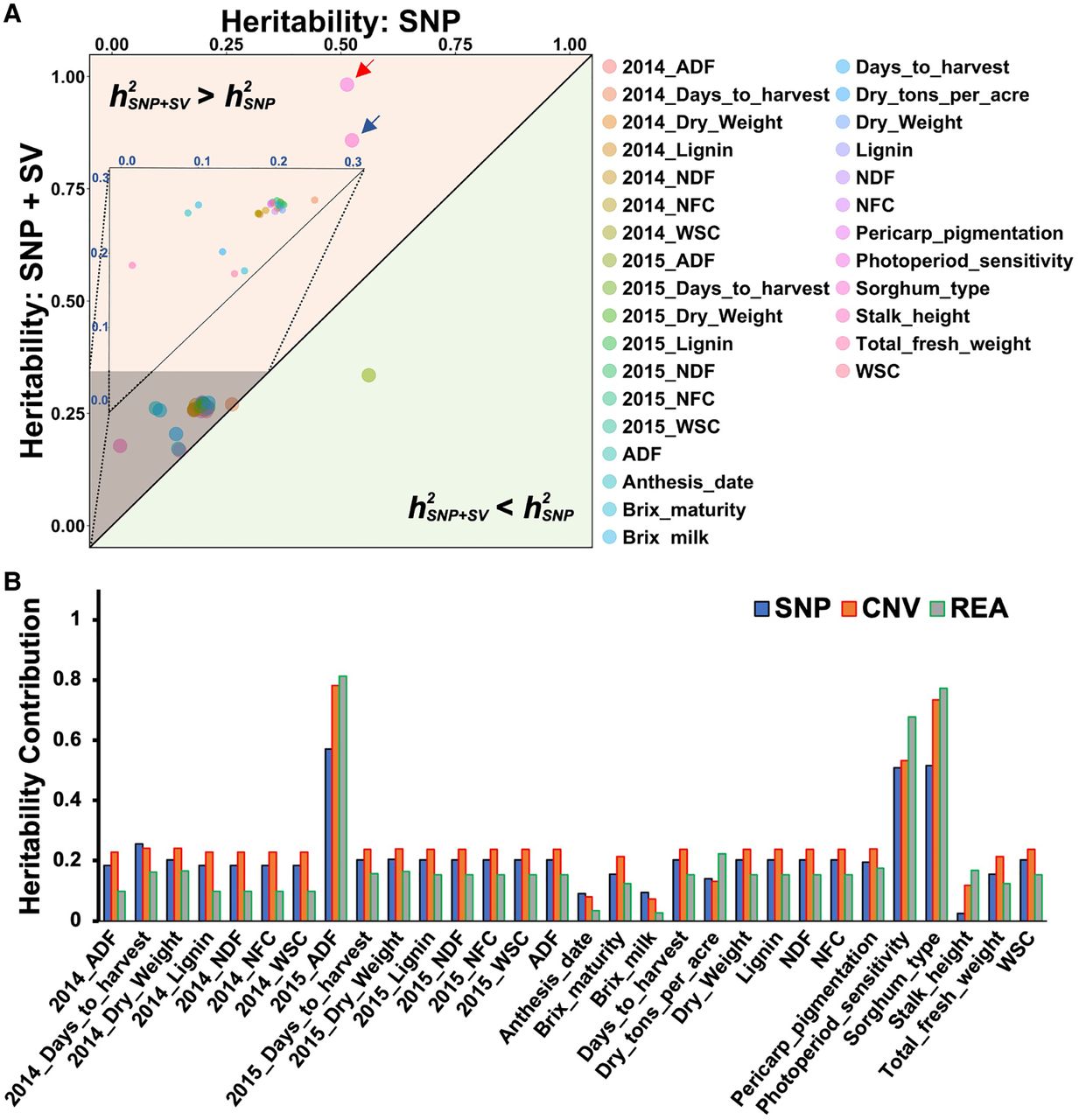 SV contributes substantially to heritability. (A) Heritability estimates are improved by the addition of SVs. Narrow-sense heritability was estimated for 29 quantitative traits and one binary trait. The upper diagonal colored by melon is the area in which the heritability of SNP + SV is greater than the heritability of SNP only (h2SNP + SV > h2SNP). The lower diagonal colored by spring green is the area in which the heritability of SNP + SV is less than the heritability of SNP only (h2SNP + SV < h2SNP). The diagonal line illustrates where heritability estimates with and without SVs are the same (h2SNP + SV = h2SNP). Thirty traits were dotted by different colors in the plot. The embedded upper triangular dot plot shows the magnification of the shaded area. All of traits, except for 2015_ADF, were observed in the upper h2SNP + SV > h2SNP area, which indicates the predicted total heritability increase for most traits when taking both SNP and SVs into account compared with taking SNPs only into consideration. This was particularly marked for two traits: photoperiod sensitivity (pointed by blue arrow) and sorghum variety type (pointed by red arrow). (B) A bar plot for estimation of heritability contribution from SNP, copy number variations (CNVs), and REA-type variation. Narrow-sense heritability was estimated for 29 quantitative traits and one binary trait (Supplemental Table S7): (2014_ADF) acid detergent fiber content in 2014; (2014_Days_to_harvest) days to harvest in 2014; (2014_Dry_Weight) dry weight of biomass in 2014; (2014_Lignin) lignin content in 2014; (2014_NDF) neutral detergent fiber in 2014; (2014_NFC) nonfibrous carbohydrates content in 2014; (2014_WSC) water-soluble carbohydrates content in 2014; (2015_ADF) acid detergent fiber content in 2015; (2015_Days_to_harvest) days to harvest in 2015; (2015_Dry_Weight) dry weight of biomass in 2015; (2015_Lignin) lignin content in 2015; (2015_NDF) neutral detergent fiber in 2015; (2015_NFC) nonfibrous carbohydrates content in 2015; (2015_WSC) water-soluble carbohydrates content in 2015; (ADF) average acid detergent fiber content of 2014 and 2015; (Anthesis_date) date of anthesis; (Brix_maturity) brix content in maturity stage; (Brix_milk) brix content in milk stage; (Days_to_harvest) average days to harvest of 2014 and 2015; (Dry_tons_per_acre) dry tons per acre; (Dry_Weight) dry weight of biomass; (Lignin) lignin content; (NDF) average neutral detergent fiber content of 2014 and 2015; (NFC) average nonfibrous carbohydrates content of 2014 and 2015; (Pericarp_pigmentation) pericarp pigmentation; (Photoperiod_sensitivity) photoperiod sensitivity; (Sorghum_type) sorghum variety type (sweet, grain, and cellulosic); (Stalk_height) stalk height; (Total_fresh_weight) total fresh weight; and (WSC) average water-soluble carbohydrates content of 2014 and 2015. Blue bars, orange bars, and gray bars with green frame indicate the heritability contributions from SNPs, CNV-type variations, and REA-type variations, respectively. For most of the traits, CNV-type variations explained more variance than REA-type variations.