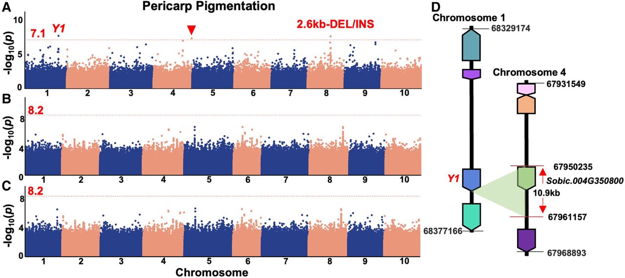 Manhattan plots of genome-wide association study (GWAS) results for “Pericarp Pigmentation.” (A) GWAS result for the pericarp pigmentation trait based on SVs alone. Three significant signals were detected using a compressed mixed linear model (CMLM) including a signal underlying the well-known pericarp pigmentation–related Y1 gene. The corresponding signal underlying the Y1 was a TRA variation between Chromosome 1 and Chromosome 4. The signal at the other breakpoint on Chromosome 4 of the TRA underlying Y1 was also detected (solid red inverted triangle). The signal on Chromosome 8 was a 2.6-kb DEL/INS located near TIM22-2 (Sobic.008G111800). (B,C) GWAS results for the “Pericarp_pigmentation” based on SNPs alone (B) and SNPs + SVs (C). The red dotted lines in the Manhattan plots show the Bonferroni-corrected threshold of α = 0.05. The red numbers near the red dotted lines were the corresponding values of the Bonferroni-corrected threshold of α = 0.05 based on different data sets; no loci reached the corrected significance threshold. (D) A diagram for the TRA underlying Y1. The corresponding signal underlying Y1 was a TRA with a ∼10.9-kb span including a coding gene (Sobic.004G350800) located on Chromosome 4 in the reference genome.