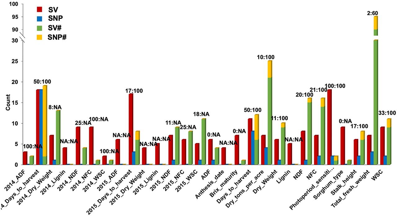 Number of significant genotype–phenotype associations detected in GWAS. Number of significant associations for 28 traits (there were 29 traits in total being analyzed, but there was no significant signal detected for “Brix_milk”) (Supplemental Table S10) detected in GWAS based on the SV (red columns, the first column per three column set), SNP (blue columns, the second column per three column set), and SNP + SV (the third stacked column per three column set, including both SVs [SV#, green] and SNPs [SNP#, orange]) data sets. (2014_ADF) Acid detergent fiber content in 2014, (2014_Days_to_harvest) days to harvest in 2014, (2014_Dry_Weight) dry weight of biomass in 2014, (2014_Lignin) lignin content in 2014, (2014_NDF) neutral detergent fiber in 2014, (2014_NFC) nonfibrous carbohydrates content in 2014, (2014_WSC) water-soluble carbohydrates content in 2014, (2015_ADF) acid detergent fiber content in 2015, (2015_Days_to_harvest) days to harvest in 2015, (2015_Dry_Weight) dry weight of biomass in 2015, (2015_Lignin) lignin content in 2015, (2015_NDF) neutral detergent fiber in 2015, (2015_NFC) nonfibrous carbohydrates content in 2015, (2015_WSC) water-soluble carbohydrates content in 2015, (ADF) average acid detergent fiber content of 2014 and 2015, (Anthesis_date) date of anthesis, (Brix_maturity) brix content in maturity stage, (Days_to_harvest) average days to harvest of 2014 and 2015, (Dry_tons_per_acre) dry tons per acre, (Dry_Weight) dry weight of biomass, (Lignin) lingnin content, (NDF) average neutral detergent fiber content of 2014 and 2015, (NFC) average nonfibrous carbohydrates content of 2014 and 2015, (Pericarp_pigmentation) pericarp pigmentation, (Photoperiod_sensitivity) photoperiod sensitivity, (Sorghum_type) sorghum variety type (sweet, grain, and cellulosic), (Stalk_height) stalk height, (Total_fresh_weight) total fresh weight, and (WSC) average water-soluble carbohydrates content of 2014 and 2015. Data labels on the top of each tripartite column set indicate the percentage of SVs (the value before the colon) and SNPs (the value behind the colon) detected in SNP + SV GWAS that were also detected in SV GWAS or SNP GWAS. (NA) There was no signal detected in SNP + SV GWAS. The number of identified signals in SNP GWAS was always the lowest compared with other data sets for all phenotypes. The detected SNP signals in SNP + SV GWAS mostly overlapped with the results of SNP GWAS. However, SVs detected in SV and SNP-SV GWAS were far from identical. This indicates that association analysis based on all three of the SNP, SV, and integrated SNP + SV data sets is necessary to dissect genetic mechanisms thoroughly.