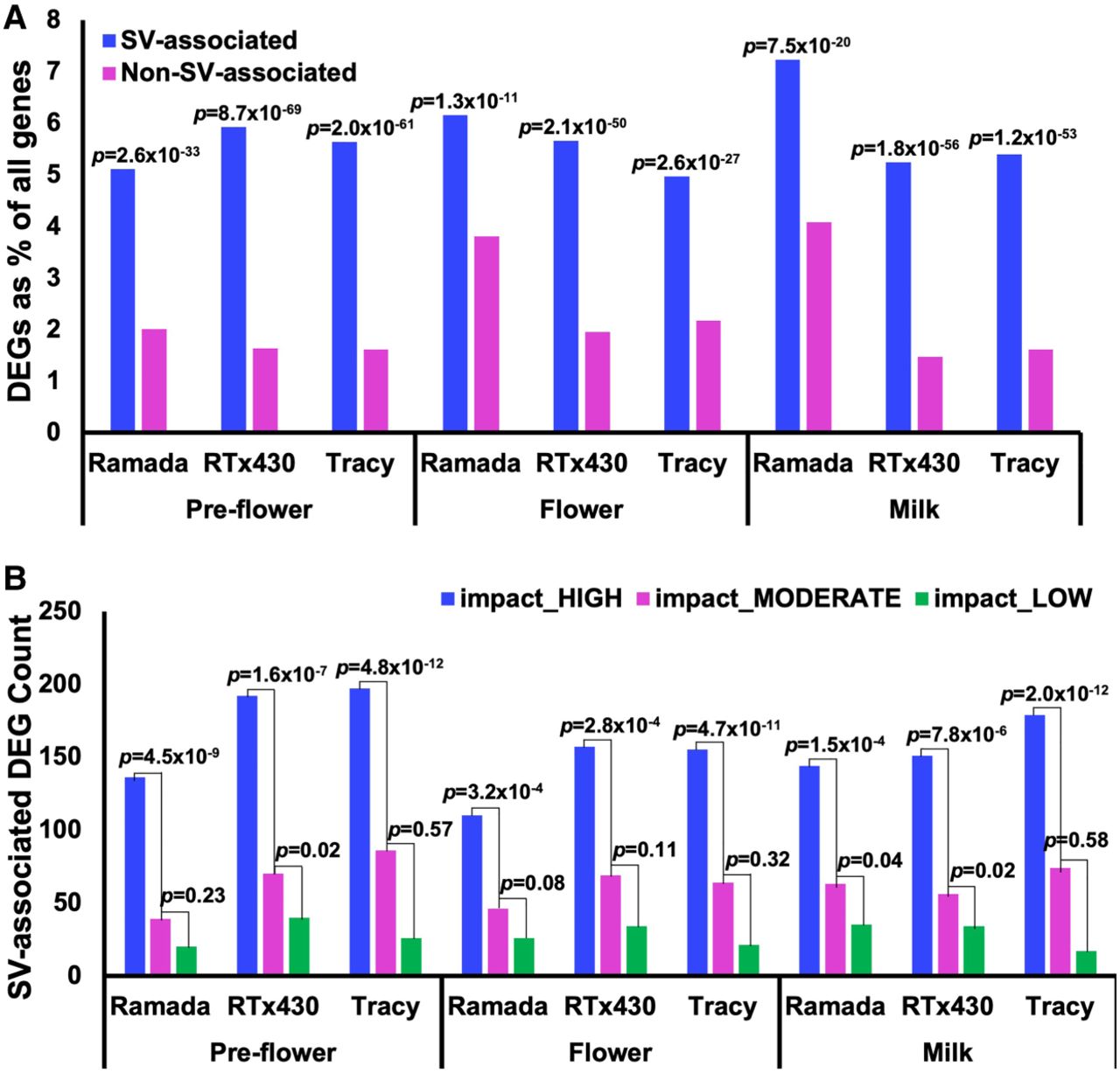 SVs have a widespread impact on gene expression. (A) SVs have an impact on gene expression in sorghum leaf across all developmental stages. The differentially expressed gene (DEG) analysis was performed by comparison of expression profiles in RTx430, Tracy, and Ramada with the expression profile in Tx623 (as control) in leaf tissue at three development stages. The blue and pink bars represent the percentages of SV-associated and non-SV-associated DEGs, respectively. The P-values on the top of SV-associated DEG bars, which were adjusted using Bonferroni correction, indicate the hypergeometric testing results for enrichment of DEGs in SV-associated genes. DEGs were significantly enriched in SV-associated genes, with SV-associated DEGs increased 1.1%∼4.3% compared with non-SV-associated DEGs in different sorghum lines. Only the results in leaf tissue were showed here. Similar results were also observed in stem tissue (see Supplemental Fig. S11A,B). (B) SV-associated DEG count changed according to different impact predictions. Different classes of variant effects were predicted by SnpEff (v5.0) (Cingolani et al. 2012). The vertical axis showed the SV-associated DEG count. The blue, pink, and green bars represent the DEG counts associated by high impact SVs (impact_HIGH), moderate impact SVs (impact_MODERATE), and low impact SVs (impact_LOW), respectively, in leaf tissue of different sorghum lines in three developmental stages (preflower, flower, and milk). The P-values show the significance levels between groups (see Methods). Differential DEG counts between “impact_HIGH” and “impact_MODERATE” were all statistically significant. The significant level of DEG counts between “impact_MODERATE” and “impact_LOW” varied depending on lines and stages. In general, higher impact SVs associated more DEGs.