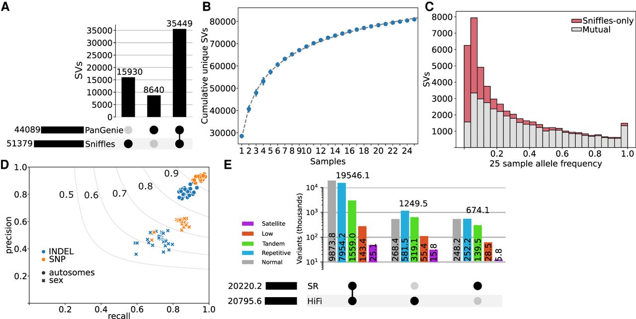 Comparison of variant calling with a small long-read cohort. (A) SV intersection between PanGenie (called from eight individuals with haplotype-resolved assemblies) and Sniffles (called from 25 HiFi read samples). (B) SV saturation for 25 HiFi read samples. Markers indicate the mean value of unique SVs over 10 random shuffles of sample order, and error bars represent the standard deviation. The dotted line is a fitted curve of the form f(x) = ax−b + c, predicting saturation at approximately 175,000 SVs. (C) SV overlap for different allele frequency (based on the 25 samples) bins. (D) Small variant accuracy of HiFi-based and short-read-based calls, taking the short-read data as truth, stratified by autosomes and sex chromosomes for SNPs and indels. Large markers indicate the mean over the 25 samples. (E) Small variant intersections between HiFi-based and short-read-based calls in genomic regions identified as centromeric satellites, low mappability, tandem repeats, repetitive, and “normal” (all other regions). A large proportion of variants called in the challenging regions were unique to HiFi-based alignment and calling.