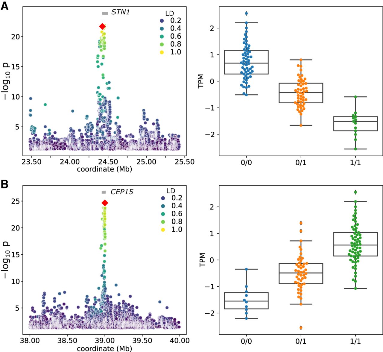 Nominal eQTL association significance (left) and normalized TPM values for the expressed gene (right) for STN1 (A) and CEP15 (B). The red diamond represents the top-associated SV. Linkage disequilibrium (LD) between the SV and all other variants within the cis-window is indicated with the color gradient.