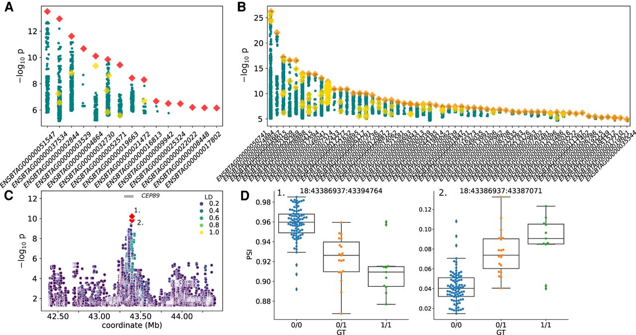 cis-sQTL mapping. (A) Fifteen independent sGene cluster signals with SVs as the unique-top variant and (B) 58 SVs as top variants in LD with small variants, with the color and marker meanings as described in Figure 4. (C) Nominal association significance for CEP89, where the two red diamonds indicate the same variant affecting two separate junction splicings within the sQTL cluster. (D) Percentage spliced in (PSI) across the two significantly associated junctions (indicated by number from C) within the sQTL cluster.
