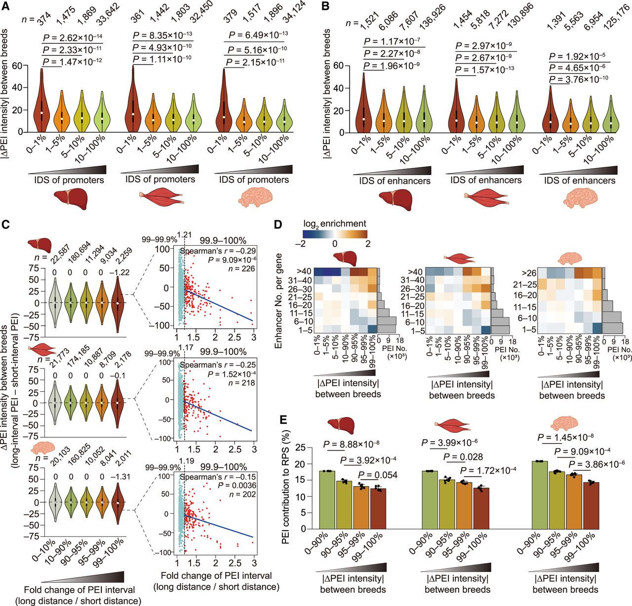 Influence of allelic sequence variations on PEIs. (A,B) Promoters (A) and enhancers (B), with higher allelic sequence divergence (especially those with the lowest 1% of IDS between parental breeds) (see Supplemental Methods), showed greater differences in PEI intensity. P-values are from a Wilcoxon rank-sum test. (C) Effects on PEI intensity caused by allelic variation-induced differences in PEI bridging distances. PEIs with the top 1% of increases in bridging distance showed significantly decreased PEI intensity (0%–99% vs. 99%–100%: P = 5.03 × 10–12 in liver, P = 2.21 × 10–6 in muscle, and P = 3.26 × 10–10 in brain; Wilcoxon rank-sum test; left). This trend is more prominent in PEIs with the greatest extension (allelic fold change in linear bridging distance of the top 0.1%: 1.17–1.21), which showed strongly negative correlations between bridging distance and PEI intensity of PEIs (Spearman's r = –0.15 to –0.29, P ≤ 0.0036; right). (D) PEIs with enrichment for differential allelic intensity (x-axis) among genes that contact a variable number of enhancers (y-axis) in the three tissues. (E) PEIs showing greater differential allelic intensity tend to contribute less to RPS (including the combined regulatory effects of multiple enhancers for a given gene) and thus exert the least impact on gene expression. P-values are from a paired Student's t-test. Hi-C maps at 5-kb resolution were used to generate these graphs.