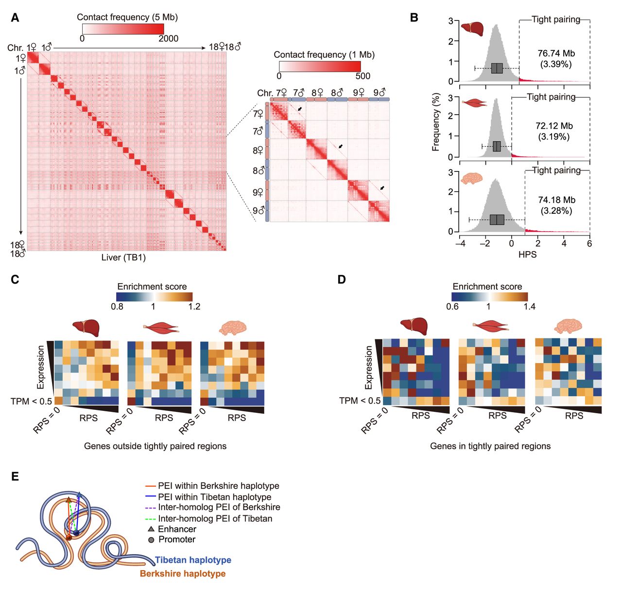 Highly structured homolog pairing in F1 hybrids. (A) Hi-C maps showing signals of genome-wide homolog pairing (arrows) in representative somatic tissue (liver) of a hybrid pig. Magnified Hi-C maps of Chromosomes 7, 8, and 9 are shown on the right. (B) Identification of tightly paired loci in all three somatic tissues of hybrid pig based on distribution of homolog pairing score (HPS) values. In the boxplot, the internal line indicates the median; the box limits indicate the 25th and 75th quartiles; and the whiskers extend to 1.5 × IQR from the quartiles. Rare tightly paired loci (liver, 76.74 Mb; muscle, 72.12 Mb; brain, 74.18 Mb) are defined as those with a HPS above Q3 + 1.5 × IQR. (C,D) Enrichment of RPSs (x-axis) from gene expression (y-axis) indicates the increased covariations between allelic expression and intra-chromosomal-based RPSs (i.e., genes with a larger RPS had higher expression) for genes outside the tightly paired regions (C) compared with genes located in the tightly paired regions (D). (E) Schematic representation of intra-chromosomal (solid lines) and inter-homolog (dashed lines) promoter–enhancer interactions in tightly paired loci; the formers are generally much stronger than the latter.