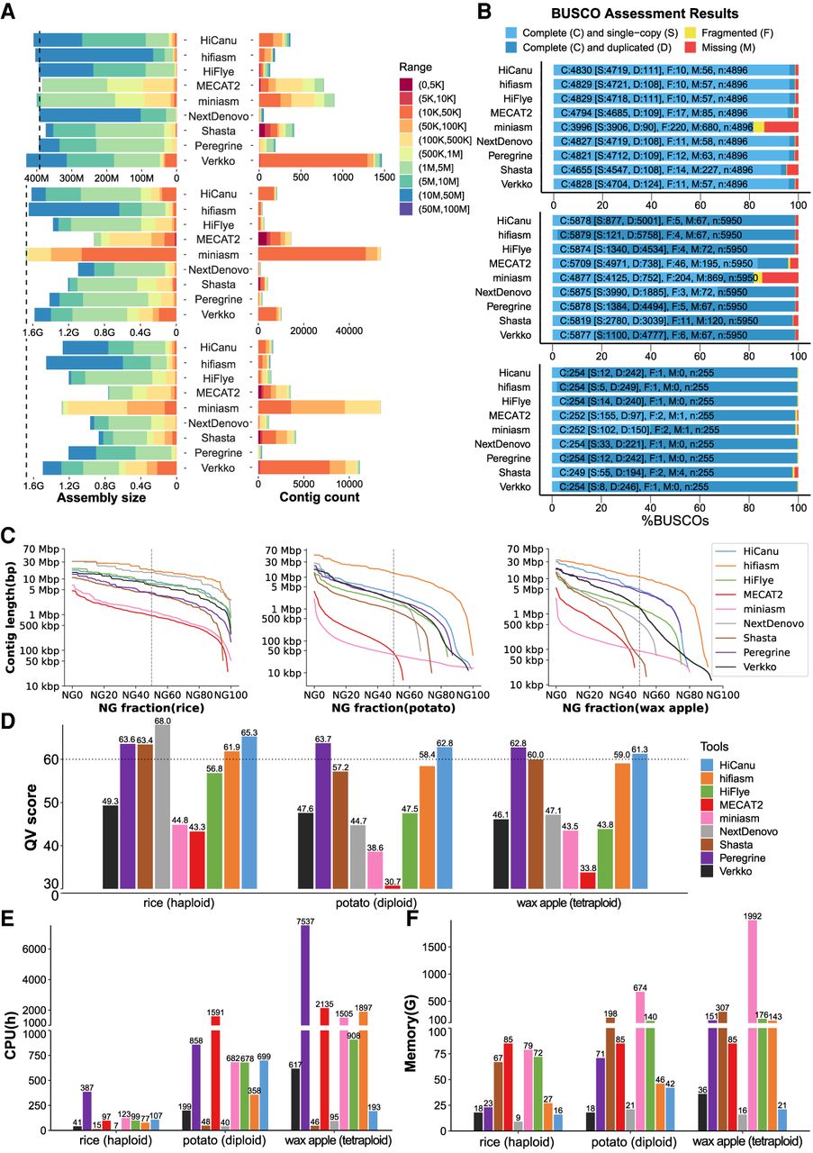 Summary of the performances of the selected genome assemblers on PacBio HiFi reads for rice (haploid), potato (diploid), and wax apple (tetraploid). (A) Cumulative total size of contigs (left) and number of contigs (right) that have a size in the range encoded by the color in the legend (top: rice; middle: potato; bottom: wax apple); the vertical dashed line indicates the expected genome size. (B) BUSCO completeness scores (top: rice; middle: potato; bottom: wax apple). (C) Contig length distribution for various choices of the NGx fraction threshold. (D) Quality value scores. (E) Running time analysis. (F) Memory usage analysis (legend on panel D also applies to panels E,F).