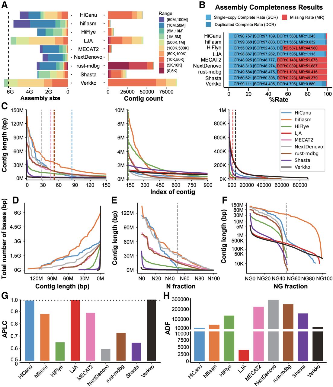 Summary of the performances of the selected genome assemblers on a human genome data set. (A) Cumulative total size of contigs (left) and the number of contigs (right) that have a size in the range encoded by the color in the legend; the vertical dashed line indicates the expected genome size. (B) Single-copy complete rate, duplicated complete rate, and missing rate. (C) Sorted contig length (left: longest 150; middle: index 150–900; right: index 900–80,000). (D) Cumulative assembly size as a function of the minimum contig length allowed in the assembly. (E) Nx length (the dashed line denotes the N50). (F) NGx length (the dashed line denotes the NG50). (G) Average proportion of largest category (APLC); the horizontal dashed line is APLC = 0.99. (H) Average distance difference (ADF).