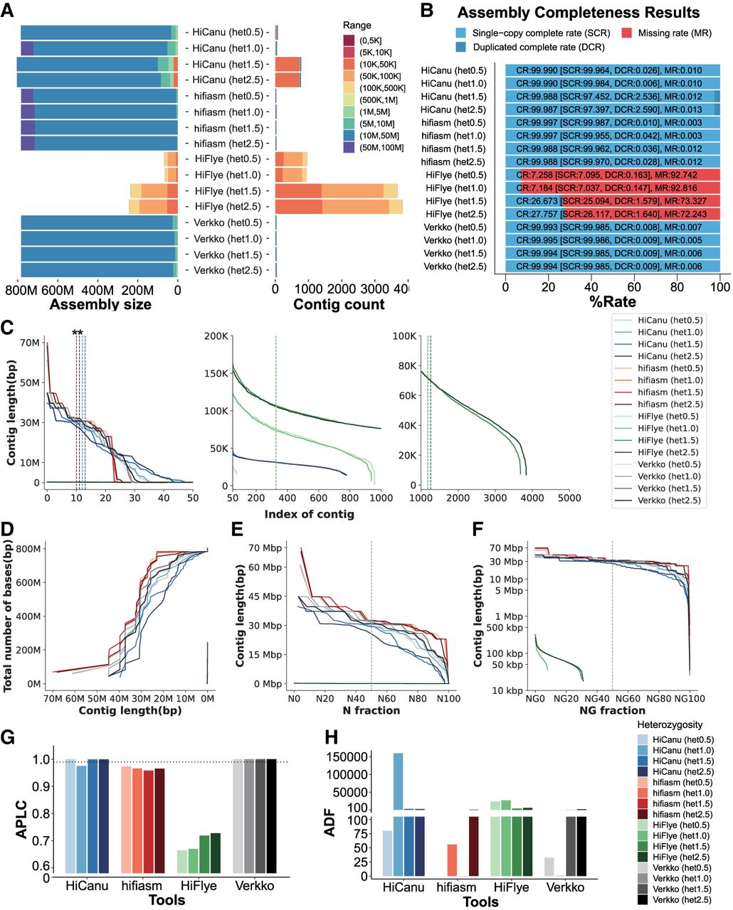 Summary of the performances of HiCanu, Verkko, hifiasm, and HiFlye on synthetic HiFi reads with heterozygosity rates of 0.5%, 1.0%, 1.5%, and 2.5%. (A) Cumulative total size of contigs (left) and the number of contigs (right) that have a size in the range encoded by the color in the legend. (B) Single complete rate, duplicated complete rate, and missing rate. (C) Sorted contig length (left: longest 50 contigs; middle: index 50–1000; right: index 1000–5000). The horizontal lines represent the corresponding N50. (*) Overlapping data. (D) Cumulative assembly size as a function of the minimum contig length allowed in the assembly. (E) Nx length (the dashed line denotes the N50). (F) NGx length (the dashed line denotes the NG50). (G) Average proportion of largest category (APLC); the horizontal dashed line is APLC = 0.99. (H) Average distance difference (ADF).