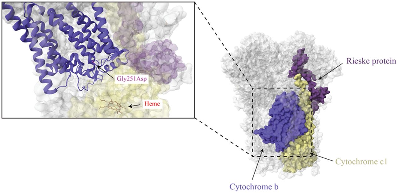 Complex III structure. The mtDNA-encoded subunit (cytochrome b) is indicated in blue with the cytochrome c1 and a Rieske protein indicated in yellow and purple, respectively. The m.15498G > A variant that results in a Gly251Asp is indicated in the enlarged image, along with a heme group in cytochrome c1 that it is located nearby (PBD ID: 5XTE) (Guo et al. 2017).