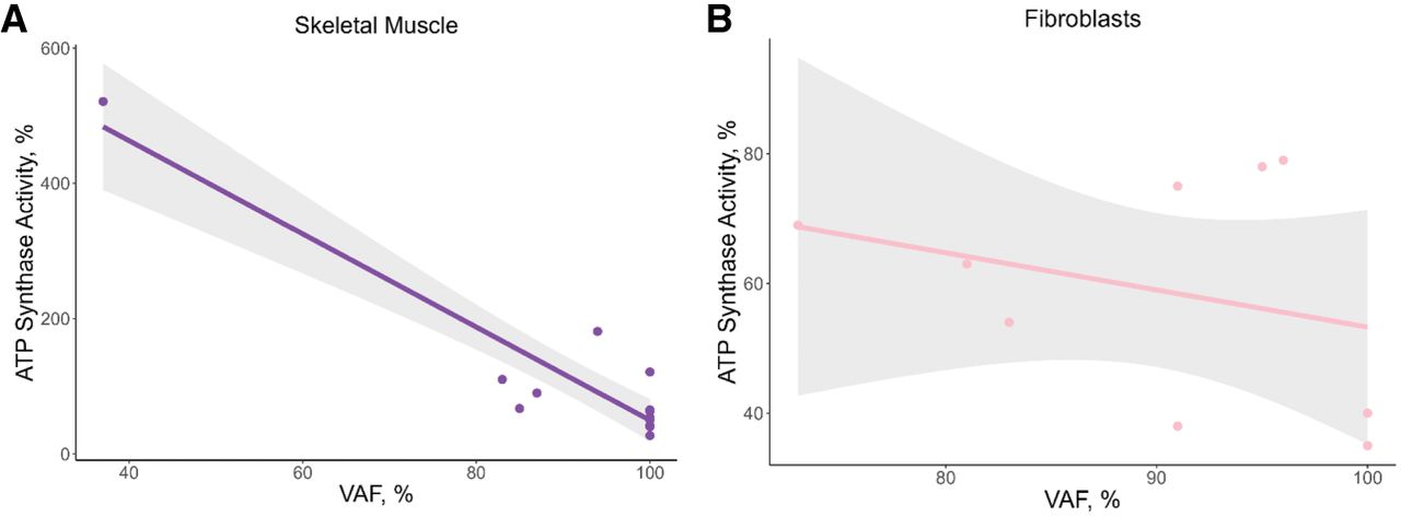 Association of m.8993T > G VAF with complex V activity. The VAF for the m.8993T > G variant in MT-ATP6 correlated with the percent residual complex V activity in skeletal muscle (A; τ = −0.58, P = 0.01, n = 13) but not in fibroblasts (B; τ = −0.11, P = 0.7, n = 9). However, it should be noted that the correlation in skeletal muscle is likely driven by a single case.