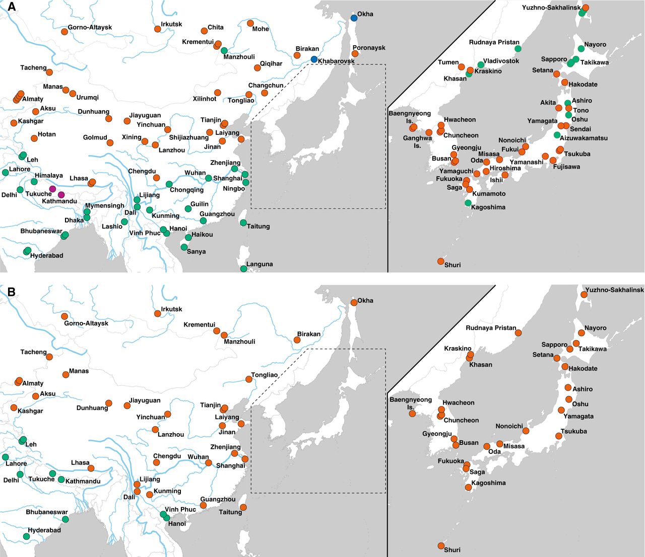 Geographic distribution of the subspecies castaneus and musculus haplotypes of mitochondrial and Y-chromosomal loci. A and B show the mitochondrial and Y-chromosomal haplotypes, respectively. The colors of circles indicate subspecies haplotypes based on genotyping: castaneus-type (green), domesticus-type (blue), musculus-type (red), and the geographically confined group of Nepalese-type (purple).
