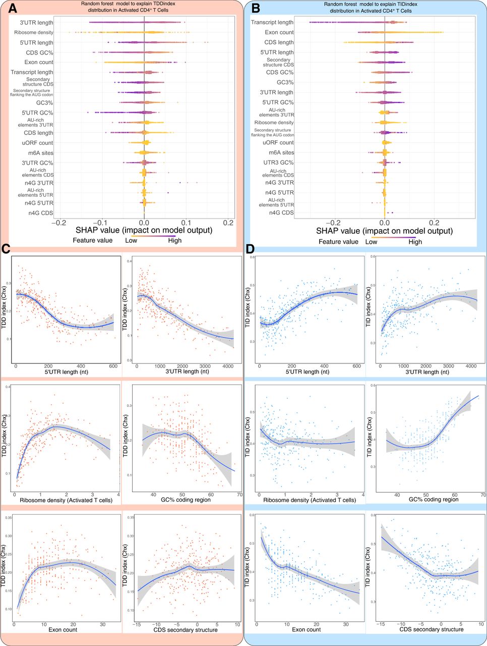Comparison of features associated with TDD in resting and activated CD4+ T lymphocytes. (A,B) Random forest decision tree analysis (with SHAP value analysis for interpreting the output of the random forest model) of transcript features to explain the observed TDDindex (left) and TIDindex (right) values in activated CD4+ T lymphocytes. Features are sorted from top to bottom with respect to their importance in predicting the TDDindex or TIDindex. (C,D) Binning plots of TDDindex (left) or TIDindex (right) against selected features. Transcripts are first ordered with respect to the feature to be compared with TIDindex and groups of 20 transcripts made along the selected feature. The mean TIDindex and feature values are plotted for each group.