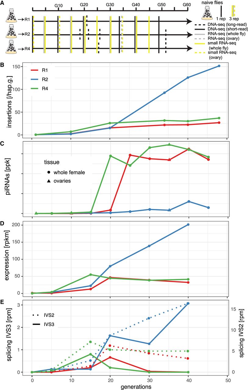 Invasion dynamics of the P-element in experimental D. erecta populations. Data are shown for three replicate populations (R1, R2, R4). (A) Overview of the experiment and the sequenced samples. (B) Insertions per haploid genome (hap.g.) during the invasion. (C) Abundance of piRNAs complementary to the P-element. (ppk) P-element piRNAs per 1000 piRNAs. (D) Sense expression of the P-element in whole female flies. Naive flies are shown at generation zero. (E) Splicing of the second (IVS2) and the third (IVS3) intron of the P-element. Naive flies are shown at generation zero. (rpm) Spliced reads per million mapped reads.