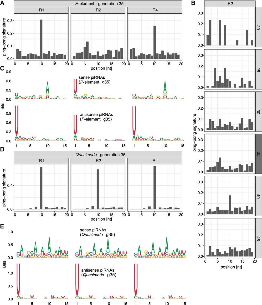 P-element ping-pong is inactive in replicate 2. (A) The ping-pong signature (peak at position 10) of the P-element in ovaries at generation 35. Note that the ping-pong signature is missing in replicate 2. (B) The ping-pong signature of the P-element in replicate 2. Data are shown for all generations with sufficient piRNAs. Small RNA extracted from ovaries and whole flies is shown in dark and light gray, respectively. (C) Motifs of sense and antisense piRNAs (23–29 nt) complementary to the P-element in ovaries at generation 35. Sense piRNAs in replicate 2 do not show an A-bias at position 10. (D) Quasimodo displays a pronounced ping-pong signature in all replicates (ovaries, generation 35). (E) Motifs of sense and antisense piRNAs of Quasimodo (ovaries, generation 35).