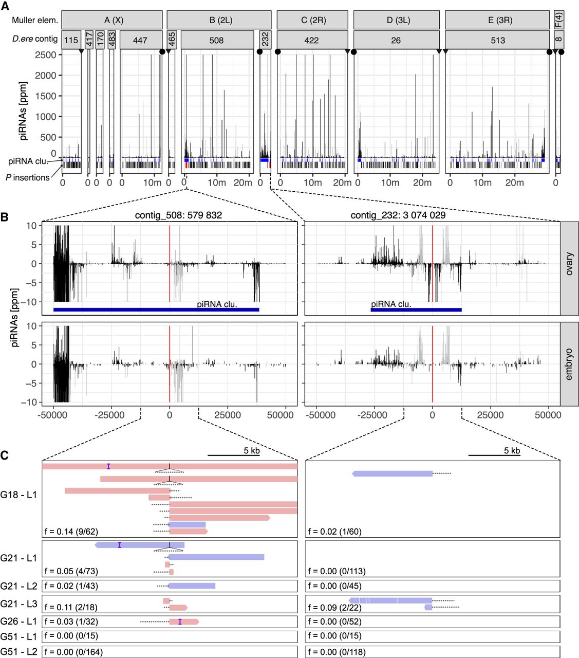 At least two P-element insertions in germline clusters are present in replicate 2 at early stages of the invasion (generations 18–26). (A) Overview of ambiguously (light gray) and unambiguously (black) mapping piRNA in 1-kb windows along the 12 largest contigs of the D. erecta assembly. The corresponding Muller element and the likely direction of the telomere (triangle) and the centromere (circle) are shown. At the bottom, we show the positions of the annotated piRNA clusters (blue) of P-element insertions outside (black) and inside of piRNA clusters (red bold; solely insertions in replicate 2 at generations 26 or less supported by at least two long reads are shown). (B) Abundance of piRNAs in a 100-kb window around the two insertions in piRNA clusters for both ovaries and embryos. Sense piRNAs are on the positive y-axis and antisense piRNAs on the negative y-axis. Ambiguously (light gray) and unambiguously (black) mapped reads are shown. (C) Support of the P-element insertions by long reads at different generations (Gxx) and in different sequencing libraries (Lx). Sense reads are shown in red, and antisense reads are in blue. Regions of the reads aligning to the P-element are shown as dashed lines (true to scale). For each library, we indicate the population frequency of the P-element insertion (f), the number of reads supporting the insertion, and coverage at the insertion site (in parentheses: reads/coverage). Note that both insertions are likely full-length P-element insertions (almost the complete P-element is covered by some reads) and that both insertions are likely lost (or at very low frequency) by generation 51.