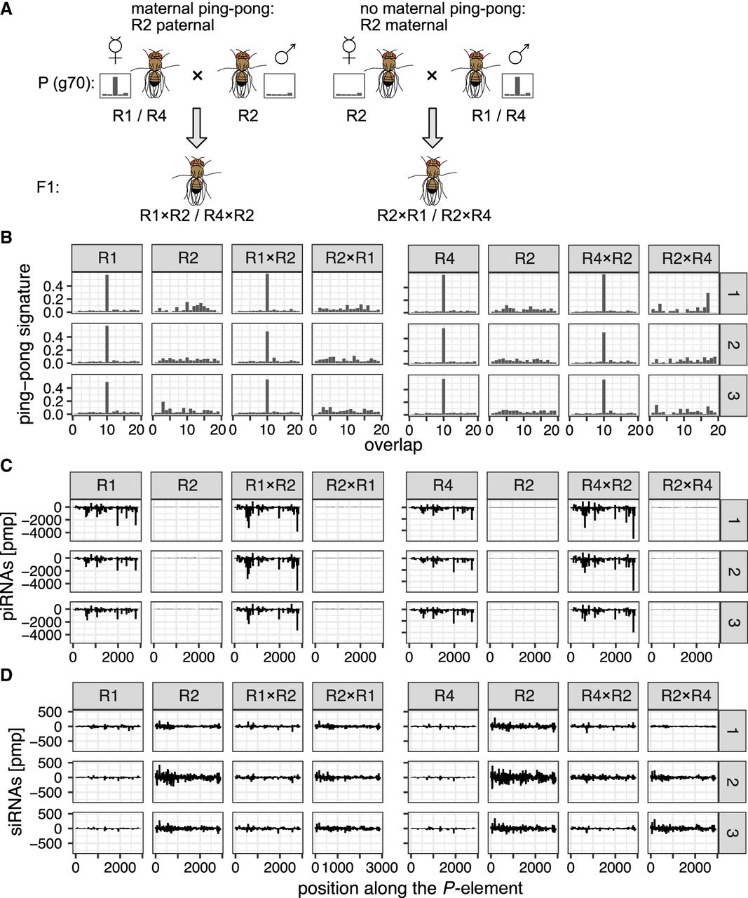Maternally transmitted factors (possibly small RNAs), and not the genomic composition, are responsible for the absence of P-element ping-pong in replicate 2. (A) Crossing scheme for testing the influence of maternal piRNAs. We performed reciprocal crosses among replicates with (R1, R4) and without (R2) ping-pong signature for the P-element. Note that in the F1 offspring of the reciprocal crosses (e.g., R1 × R2 vs. R2 × R1), the genomic background is largely identical, whereas the composition of the maternally deposited piRNAs differs. The flies for this experiment were sampled around generation 70 from the experimental populations. (B) Ping-pong signatures for the P-element in all three replicates (R1, R2, R4) and in the F1 offspring of the reciprocal crosses among the replicates (e.g., R1 × R2: R1-female × R2-male). Small RNA was extracted from whole female flies, and three subreplicates (right panel) were used for each sample. (C) Distribution of piRNAs (23–29 nt) in the three replicates and the F1 offspring. (D) Distribution of siRNAS (20–22 nt) in the three replicates and the F1 offspring.