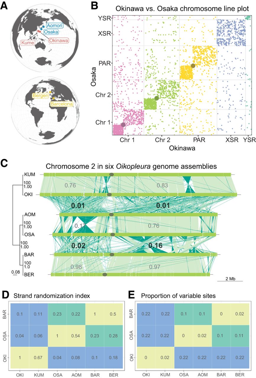 Extensive genomic rearrangement in Oikopleura dioica lineages. (A) Geographical map locating the origin of the lineages and assemblies. (B) Line plot representation of the whole-genome alignment between the Okinawa and Osaka genomes. Each chromosome is plotted in a different color that will identify them in the following figures. A gray dot is overlaid at the position of centromeres. (C, left) Maximum likelihood phylogenetic tree of 5162 single-copy orthologous genes common to all O. dioica genomes. The tree is midpoint-rooted with clade support values indicating bootstrap values from RAxML and Bayesian posterior probability from MrBayes. Branch lengths are proportional to the estimated number of substitutions per nucleotide site. (Right) Pairwise comparisons of Chromosome 2 between Oikopleura genomes (names abridged with their first three letters). Dark green indicates plus/minus-strand alignments; the gray ellipse, the centromere. The numbers indicate the scrambling index computed for a given arm pair. (D,E) Scrambling index (D) and proportion of variable sites (E) across all single-copy orthologous nucleotide sequences for same-lineage (green), Osaka–Barcelona (yellow), and Okinawa–other (red) pairs of genomes.