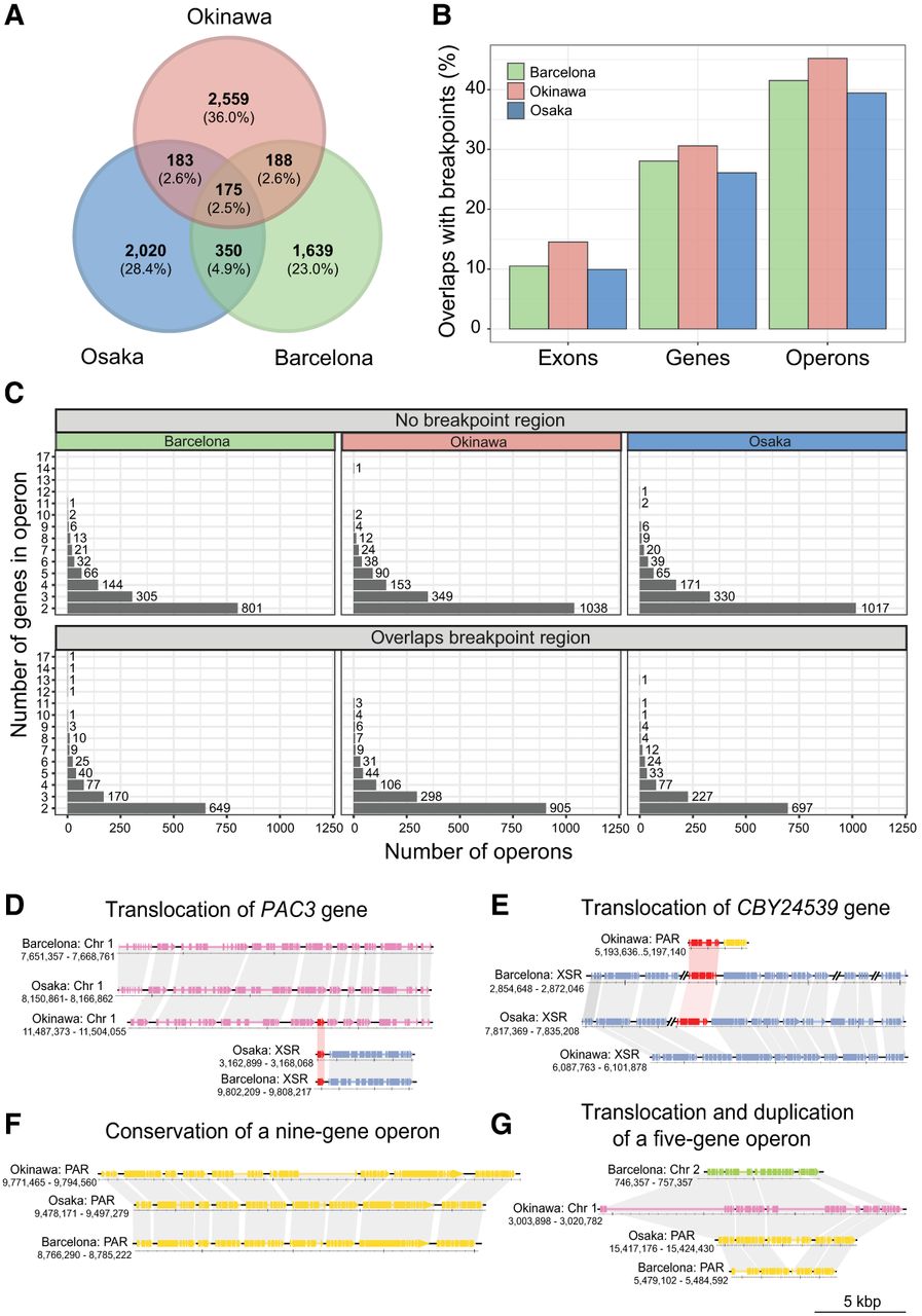 Conservation of operons in O. dioica lineages using the chromosome-level genomes as representatives. (A) Number of shared and unique operons across the chromosome assemblies representing each lineage. (B) The proportion of protein-coding genetic elements that overlap a breakpoint region for each genome. (C) Size distribution of operons that overlap or do not overlap a breakpoint region. (D,E) Translocation of the genes PAC3 (D) and CBY24539 (E; putative activin type I receptor), belonging to different operons in Okinawa lineages and the other lineages. (F) The nine-gene operon reported by Ganot et al. (2004) is conserved in Osaka, Barcelona, and Okinawa. (G) An example of an operon that has been translocated to different chromosomes in each species and duplicated in the Barcelona genome.