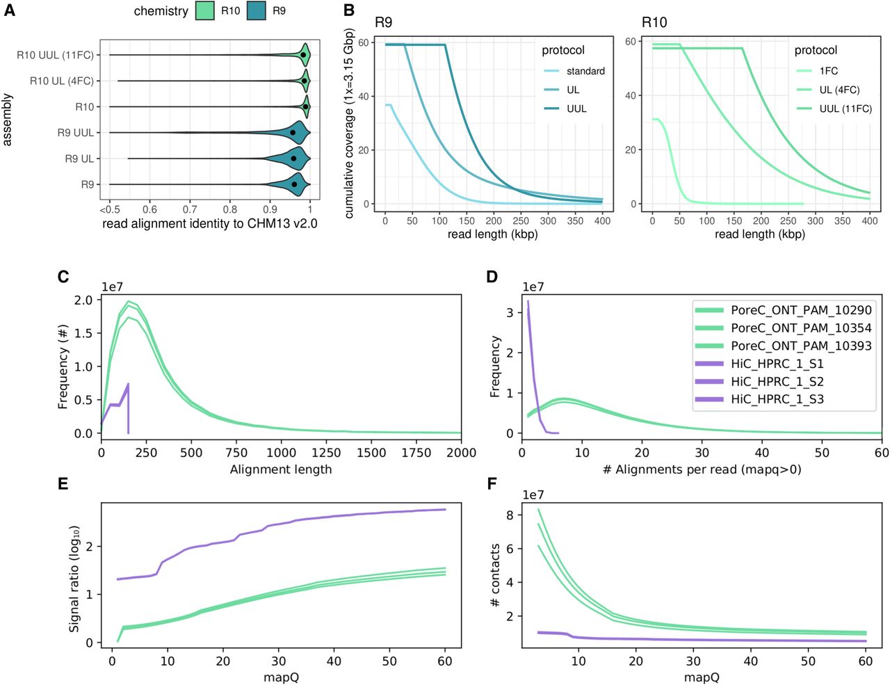 Distributions of read accuracy, coverage, length for reads used in assembly phasing, and phasing signal for proximity-ligated reads. (A,B) Identity and length metrics for nanopore read sets used in the HG002 evaluation. (C–F) Pore-C and Hi-C metrics for contacts and signal ratio, measured on a per-library basis. “Alignment length” and “alignments per read” are proxies for subread statistics. Only mappings that are usable for phasing are shown, that is, with mapping quality (mapQ) > 0 in a diploid reference. Signal ratio is computed using a high-quality trio-phased assembly to indicate the number of consistent and inconsistent contacts (see Methods).