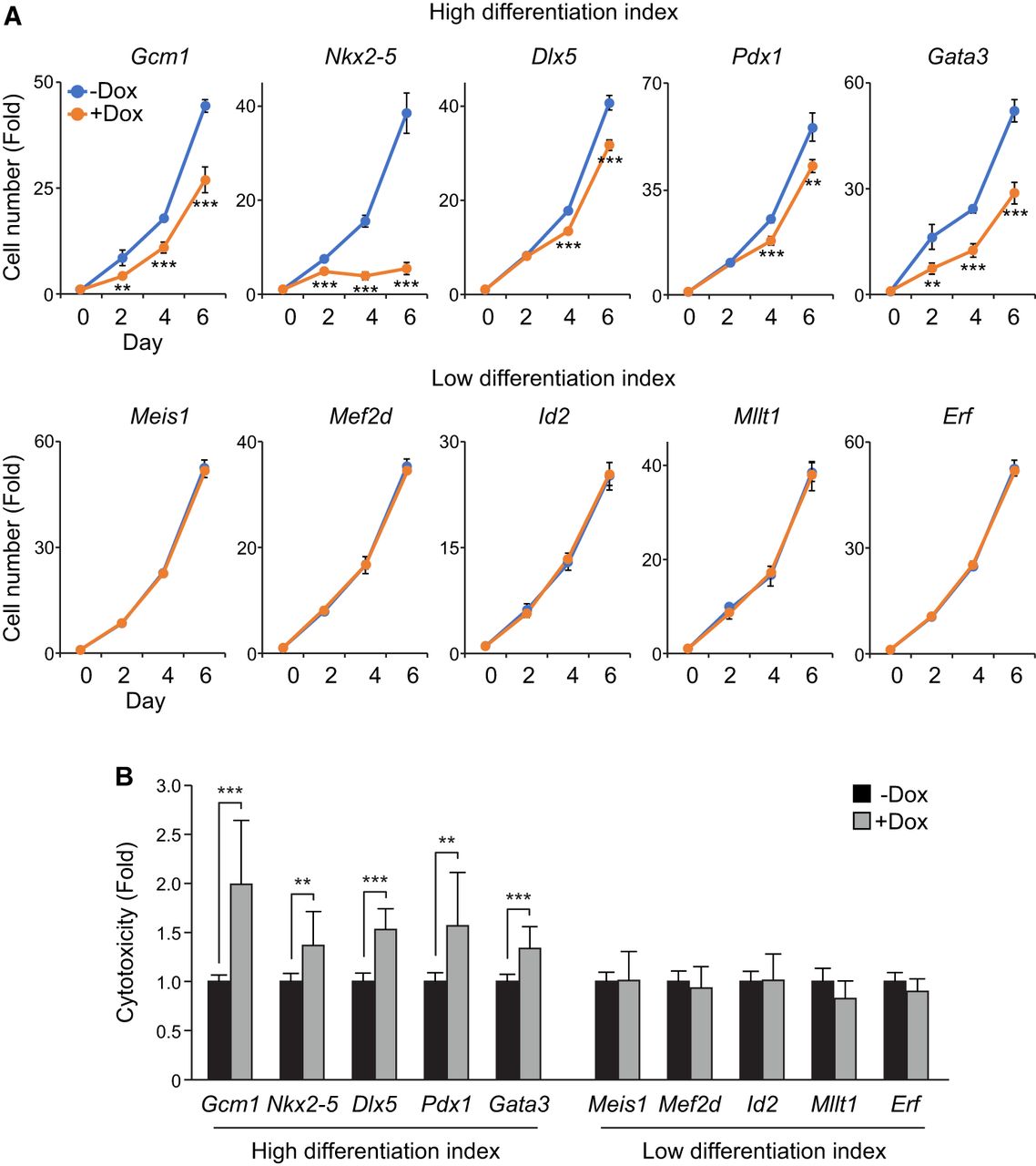 ES cells experiencing fate changes show slower proliferation and increased cell death. (A) Line plots depicting the time course measurement of cell number upon overexpression of iTFs via Dox induction (0.5 µg/mL; +Dox). The untreated cells (−Dox) were used as a control. The top row represents iTFs with high differentiation indexes, and the bottom row represents iTFs with low differentiation indexes. Cell numbers were counted up to 6 d after Dox induction, and the fold changes in cell numbers from day 0 were calculated and plotted (n = 2). Data were represented as mean ± SD, and a Student's t-test was performed to determine significance between −Dox and +Dox: (**) P < 0.01, (***) P < 0.001. (B) A bar plot shows the fold change in cell death in 10 iTF lines upon overexpression of the iTF by treating Dox (0.5 µg/mL) for 2 d. The cytotoxicity was calculated by measuring lactate dehydrogenase (LDH) activities in the culture media. The percentage of cytotoxicity was calculated for each value by dividing it against the value from the wells treated with lysis buffer, which provided the maximum LDH activity. The fold change was calculated against the control samples. Finally, the average percentage of cytotoxicity was calculated across replicates (n = 3–6), and a Student's t-test was performed to determine significance: (**) P < 0.01, (***) P < 0.001.