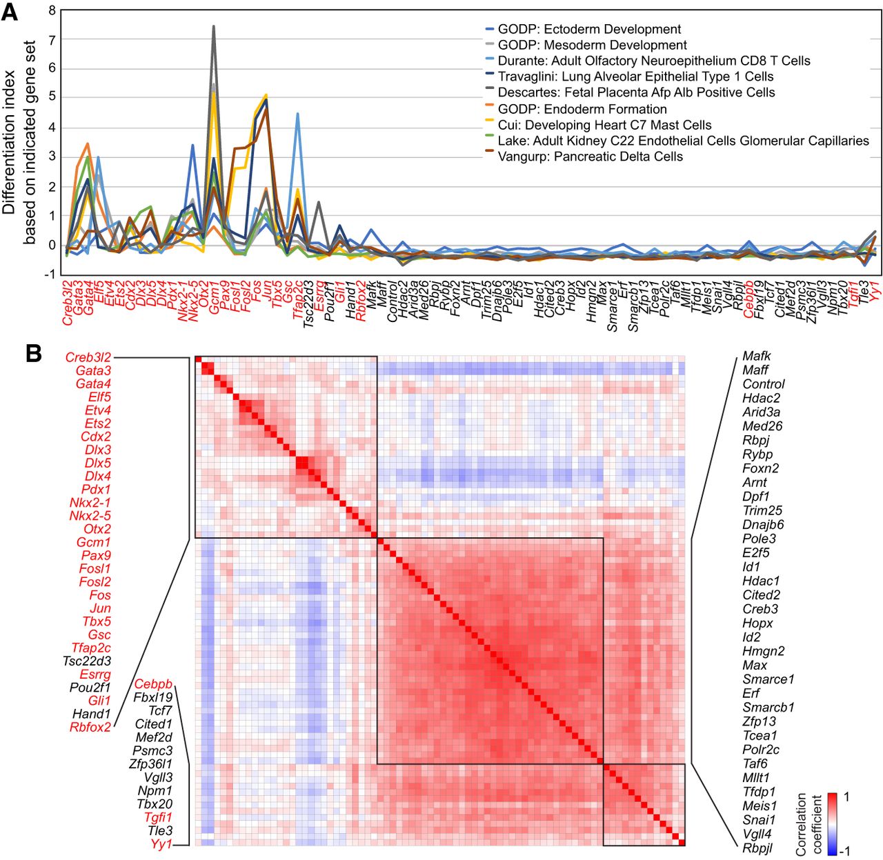 iTF-mediated lineage specification. (A) Differentiation index calculated with gene expression responses to the induction of 80 individual TFs (day 1) and indicated gene sets obtained from MSigDB signature gene set collection. Red text indicates TFs harboring cell fate conversion potential defined by differentiation indexing (Fig. 3A). (B) Similarity matrix of iTFs calculated from the differentiation indexes, which were based on all pairs of iTFs and 643 gene sets from MSigDB. Some groups of TFs show high similarity and form clusters of red cells and black boxes, meaning they have similar differentiation indexes across various cell type– or lineage-specific gene sets. Red text indicates TFs with cell fate conversion potential defined by differentiation index.