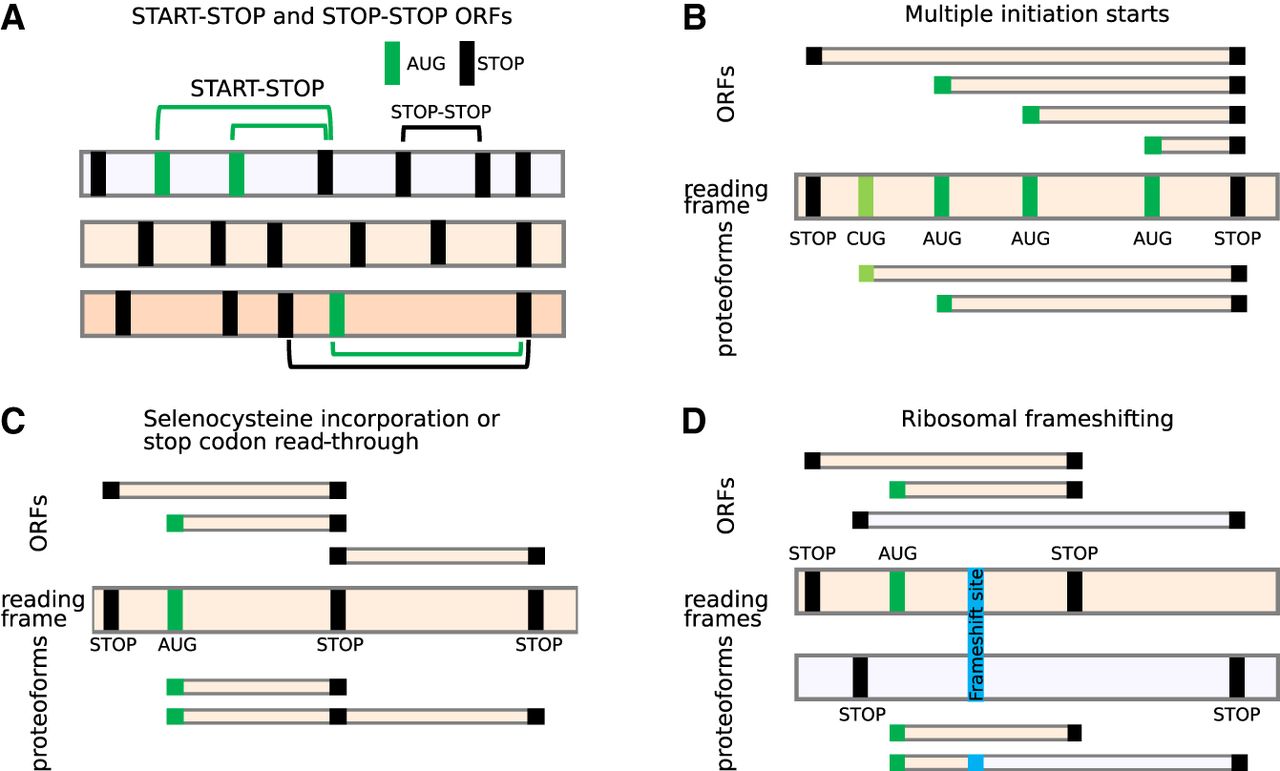 ORFs do not adequately represent translational complexity. (A) Two formal definitions of ORFs. Three reading frames are shown as horizontal bars, with vertical bars corresponding to AUG (green) or stop codons (black). Several examples of start-stop (green arcs) and stop-stop (black arcs) ORFs are shown. (B–D) The relationship between ORFs (top) and expressed proteoforms (bottom) for mRNAs with different locations of starts and stops (middle). Only two relevant reading frames are shown for simplicity. (B) An RNA encoding two proteoforms with alternative N termini owing to utilization of two start codons. Because of multiple potential AUG codons, there are many start-stop ORFs whose conceptual translation does not correspond to encoded proteoforms. A stop-stop ORF does not reflect the existence of alternative proteoforms. (C) In the case of stop codon read-through or selenocysteine insertion, ribosomes may read-through specific stop codons by incorporating an amino acid, yielding a product that cannot be described as a product of a single ORF. (D) Similarly, ribosomal frameshifting generates a trans-frame protein (blue) that does not represent a product of a single ORF.