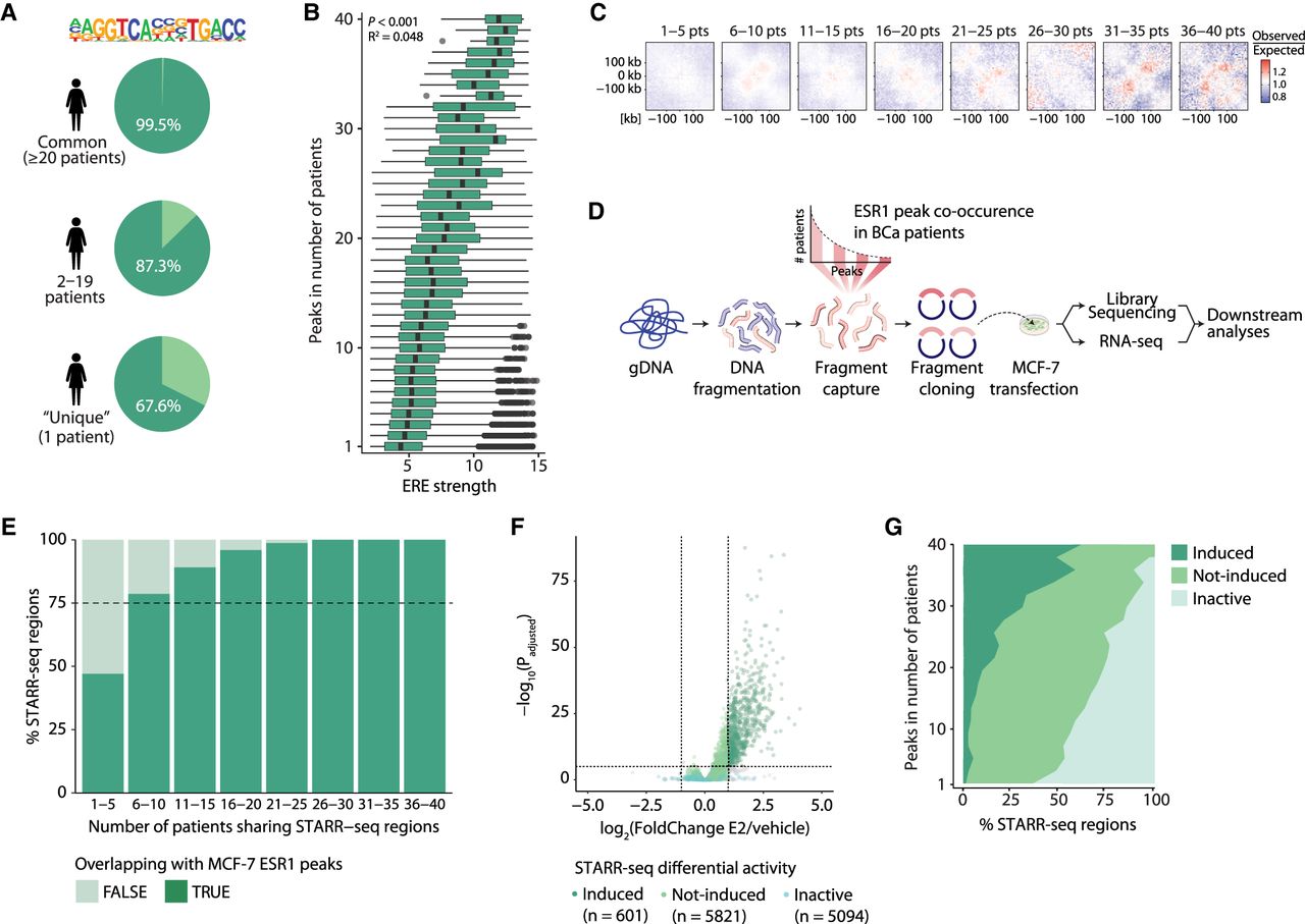 Common ESR1 peaks are associated with stronger ERE motif, increased chromatin interactions, and higher enhancer activity. (A) The percentage of common, less common, and patient-unique ESR1 peaks in females that contain an estrogen response element (ERE). (B) The strength of those EREs as determined by HOMER, ranked from those in common to those in more patient-unique ESR1 peaks. Black dots represent outliers. (C) Aggregate region analyses (ARAs) showing the average Hi-C contacts (observed over expected scores) at ESR1 binding sites shared by an increasing number of patients from left to right. The matrices include a window of ±250 kb from the ESR1 peak centers. (D) Schematic overview of STARR-seq methodology. (E) Stacked bar plot showing the overlap between STARR-seq regions and MCF-7 ESR1 peaks (Ross-Innes et al. 2012) in bins of female patient STARR-seq shared regions. (F) Volcano plot of STARR-seq results in the cell line MCF-7 upon 6 h of 10 nM estradiol (E2) stimulation. (G) Distribution of enhancer activity as determined by STARR-seq upon 6 h of 10 nM estradiol stimulation, from common to more patient-unique peaks. Details on cutoffs for categories induced, not-induced, and inactive are described in the Methods section.