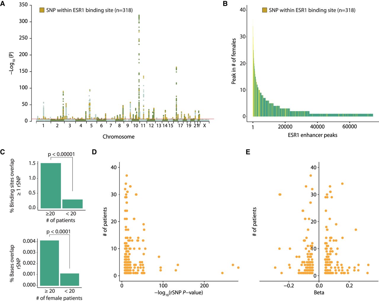 ESR1+ breast cancer rSNPs are enriched at regions with low inter-patient heterogeneity in ESR1. (A) Manhattan plot of ESR1+ breast cancer risk SNPs (rSNPs) with genome-wide significance originating from Michailidou et al. (2017). Highlighted in orange are 318 rSNPs, for which the coordinates intersect with one of the 74,438 ESR1 peaks found among 40 female breast cancer patients. (B) The position of these 318 rSNPs in the ranked peaks introduced in Figure 2A. (C, top) Comparison (Fisher's exact test) of the percentage of ESR1 peaks with which coordinates overlap with at least one rSNP coordinate, for common and less common ESR1 peaks. (Bottom) Comparison (Fisher's exact test) of the percentage of bases, present in common or less common ESR1 peaks, that overlap with at least one rSNP coordinate. (D) Correlation between the P-value of rSNP (x-axis) and its position in the ranking of ESR1 peaks introduced in Figure 2A (y-axis). If multiple rSNPs overlapped the same ESR1 peak, the strongest P-value was used for analysis. (E) Overview of beta values corresponding to rSNPs with which a coordinate intersected an ERE. Negative beta values correspond with rSNPs that confer less risk to breast cancer, whereas positive beta values correspond to increased risk of ESR1+ breast cancer.