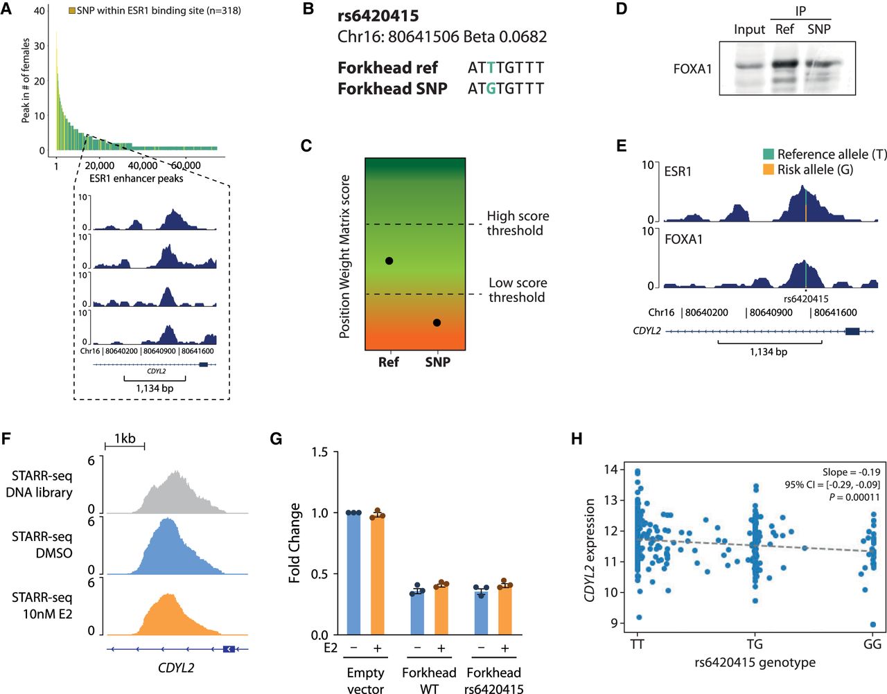 rs6420415 affects CDYL2 expression via reduced FOXA1 binding by impacting the forkhead motif. (A) Snapshots of ESR1 peak intersecting the coordinate of rs6420415. The peak, positioned in an intron of CDYL2, was found in four female patients. (B) Forkhead motif at this peak, in reference allele and rSNP format. (C) Predicted score of position weight matrix for reference allele and rSNP forkhead motif by SNP2TFBS (Kumar et al. 2017). (D) FOXA1 western blot of pulldown by 50-bp biotin-labeled oligos containing the WT or rs6420415 variant of the forkhead motif. (E) Distribution of reads in the ESR1 and FOXA1 ChIP-seq peak performed on tumor tissue from the same breast cancer patient, at the locus surrounding rs6420415. (F) Snapshot of STARR-seq normalized signal at the CDYL2 locus. (G) Luciferase reporter assay in MCF-7 cells stimulated or not by estradiol (E2) for the CDYL2 locus enhancer activity containing or not the rs6420415 variant. Bar plot represents the fold change of luciferase expression over the untreated empty vector condition. (H) TCGA gene expression of CDYL2, which rs6420415 is predicted to affect, by homozygous or heterozygous genotype for rs6420415.
