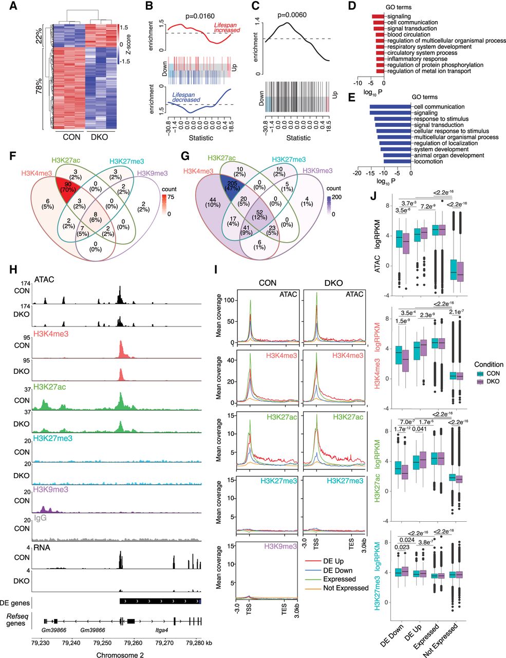 Suv39-dependent H3K9me3 loss causes predominant gene repression in euchromatic regions. (A) Heatmap showing change of expression (logRPKM) of differentially expressed (DE) genes between Suv39h1 and Suv39h2 double-knockout (DKO) and control cells. The proportions of genes down-regulated and up-regulated in Suv39DKO cells versus control are annotated. (B) Barcode enrichment plot showing ranking of aging-related genes from the GenAge database (de Magalhaes et al. 2009) among the DE genes. Genes are ranked right to left from most up-regulated to most down-regulated in DKO cells. The rank of genes associated with increased lifespan is marked by red vertical bars and that of genes associated with decreased lifespan by blue vertical bars. Red and blue worms show relative enrichment. ROAST gene set test P-values tests correlation. (C) Same as D but with directionality removed to include genes with contradictory annotated life span effects. (D,E) Gene Ontology (GO) enrichment in up-regulated (D) and down-regulated (E) DE genes. (F,G) quantification of overlap between up-regulated (F) and down-regulated (G) DE gene promoters (2 kbp upstream/500 bp downstream) and H3K4me3, H3K27ac, H3K27me3, and H3K9me3 ChIP-seq peaks from control DP thymocytes as called by HOMER. (H) Example tracks of the region surrounding the promoter of a down-regulated DE gene (Itga4) showing ATAC-seq, ChIP-seq (H3K4me3, H3K27ac, H3K27me3, H3K9me3, IgG), and RNA-seq data. (I) Plots of mean coverage from 3 kb upstream of the transcription start site (TSS) to 3 kb downstream of the transcription end site (TES) of up-regulated (DE Up), down-regulated (DE Down), and non-DE (divided into expressed and nonexpressed genes based on expression level in control cells) showing chromatin accessibility (ATAC) and H3K4me3, H3K27ac, H3K27me3, H3K9me3 H3K27ac, H3K9me3 ChIP-seq data. (J) Boxplots of ATAC, H3K4me3, H3K27ac, and H3K27me3 logRPKM across gene promoters (2 kbp upstream/500 bp downstream) that are up-regulated (DE Up), down-regulated (DE Down), and non-DE (divided into expressed and nonexpressed genes based on expression level in control cells). Box plots depict the interquartile range (IQR) ± 1.5 × IQR with median annotated. Distributions were compared by Wilcoxon test.