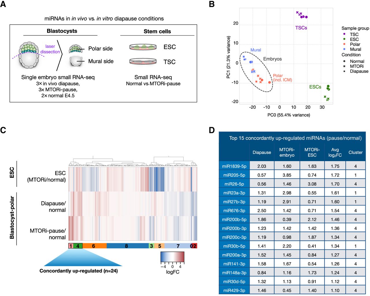 Up-regulation of a set of miRNAs is associated with dormancy. (A) Schematics of sample preparation for small RNA profiling. In vivo diapaused, in vitro diapaused, and normal E4.5 mouse blastocysts were dissected via laser microdissection to separate polar and mural ends (see Supplemental Fig. S3A). ESCs and TSCs were cultured under standard conditions with or without MTORi. Small RNA expression profiles of single embryo parts and bulk stem cells were generated via low-input small RNA-seq. (B) PCA plot of small RNA-seq data sets. Stem cells and embryos are separated along PC1 (55% variance). The polar embryo, which includes pluripotent cells, clusters closer to ESCs, whereas the mural embryo clusters closer to TSCs (PC2, 21% variance), suggesting small RNA expression profiles reflective of tissue of origin. In vivo diapaused embryos show higher variability than other groups. (C) Heatmap showing miRNA expression changes in diapaused embryos (in vitro and in vivo) compared with normal blastocysts and in paused ESCs compared with normal ESCs. miRNAs were clustered into nine clusters based on their expression levels in the three samples (for corresponding silhouette, see Supplemental Fig. S3E). Clusters 4 and 1 show a concordant trend of up-regulation on average and are the focus of the rest of the study. (D) The top 15 concordantly up-regulated miRNAs and their log2FC values in each condition.
