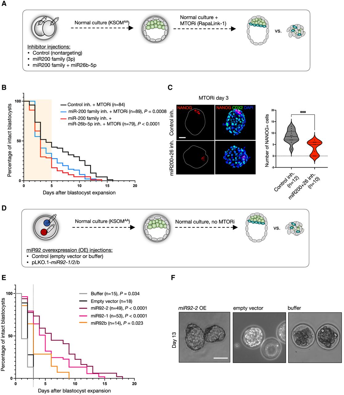 Combinatorial miRNA activity promotes efficient transition to dormancy during in vitro diapause. (A) Schematics of the experiment. Two-cell-stage embryos were microinjected with synthetic miRNA inhibitors (antimiRs) against the miR-200 family and miR-26b-5p or with a control inhibitor (nontargeting). After injection, the embryos were cultured until the blastocyst stage under standard conditions and treated afterward with DMSO or RapaLink-1 to induce in vitro diapause. (B) Survival curves of embryos generated as described above. The number of expanded embryos was counted every day. Embryos with a blastocoel and unfragmented TE were considered intact. Statistical test is a Mantel–Cox test with control inhibitor + MTORi as the reference data set. (n) Number of embryos. (C) Immunofluorescence staining of control-injected or antimiR-injected representative embryos on day 3 of MTORi treatment for the epiblast marker NANOG, the trophectoderm marker CDX2, and the DNA stain DAPI. Right panels show the number of NANOG+ cells per embryo in each condition. (n) Number of embryos. Statistical test is an unpaired t-test with Welch's correction. (***) P-value < 0.001. Scale bar, 20 µm. (D) Schematics of miR92 overexpression (OE). Zygotic pronuclei were injected with the linearized miR92 overexpression construct (pLKO.1 background, U6 promoter), empty vector, or injection buffer. The embryos were cultured in standard medium without MTORi until the end of the assay. For scoring, the same procedure as in A is applied. (E) Survival curves embryos miR92 OE or control embryos. (n) Number of embryos in each group. Statistical test is a Mantel–Cox test with empty vector injection as the control data set. (F) Bright field images of miR92 OE or control embryos on day 13 of in vitro culture without MTORi. Scale bar, 100 µm.