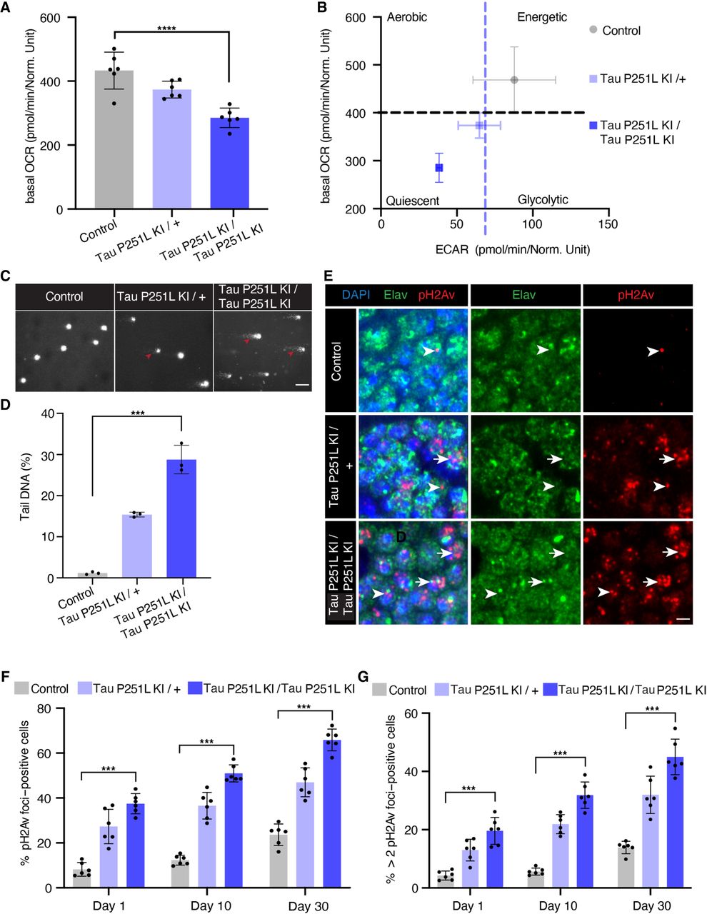Mitochondrial dysfunction and DNA damage in Tau P251L knock-in brains. (A,B) Decreased oxygen consumption rate (OCR; A) and shift to a quiescent metabolic phenotype as indicated by plotting the OCR versus the extracellular acidification rate (ECAR; B) in homozygous and heterozygous Tau P251L knock-in brains compared with controls. n = 6 per genotype. (C,D) Elevated levels of DNA damage in Tau P251L knock-in brains as indicated by increased tail length (arrowheads) following electrophoresis of nuclei from dissociated brains in the comet assay. n = 3 per genotype. (E) Increase in the number of Kenyon cells neurons (identified by the neuronal marker elav) containing DNA double-strand breaks as marked by pH2Av foci (arrowheads; arrows indicate neuronal nuclei with more than two foci) in histological sections of mushroom bodies (Kenyon cells) from Tau P251L knock-in animals, as quantified in F,G. n = 6 per genotype and time point. Scale bars represent 5 µm. Flies are 10 d old in A–D, 30 d old in E, and the age indicated in the figure labels in F,G. Data are presented as mean ± SD. (***) P < 0.001, one-way ANOVA with Tukey post-hoc analysis.