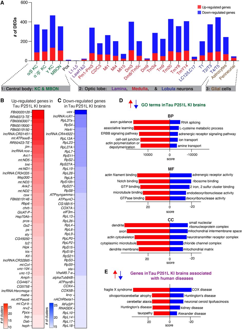 Differential gene expression and enrichment analysis of the scRNA-seq data set in Tau P251L knock-in brains compared with controls. (A) The number of differentially expressed genes (DEGs), both up-regulated and down-regulated genes, in all the annotated clusters of Tau P251L knock-in brains compared with controls. Results are displayed across three major anatomic and functional classes of cells: (1) central body containing three clusters of Kenyon cells (KCs), mushroom body output neurons (MBONs) and pox neurons; (2) optic lobe neurons containing lamina, medullary, and lobula neurons clusters; and (3) glia cells containing astrocytes and perineurial clusters. (B,C) Heatmaps of the top 50 up-regulated (B) and down-regulated (C) genes in all the clusters of Tau P251L knock-in brains compared with controls (Supplemental Table S3). (D) Gene Ontology (GO) enrichment analysis identified top up-regulated and down-regulated biological processes (BPs), molecular functions (MFs), and cellular components (CCs). (E) Analysis of human disease–associated genes revealed top up-regulated and down-regulated disease-associated gene sets. Score represents the combined score c = log(p) × z (Chen et al. 2013).