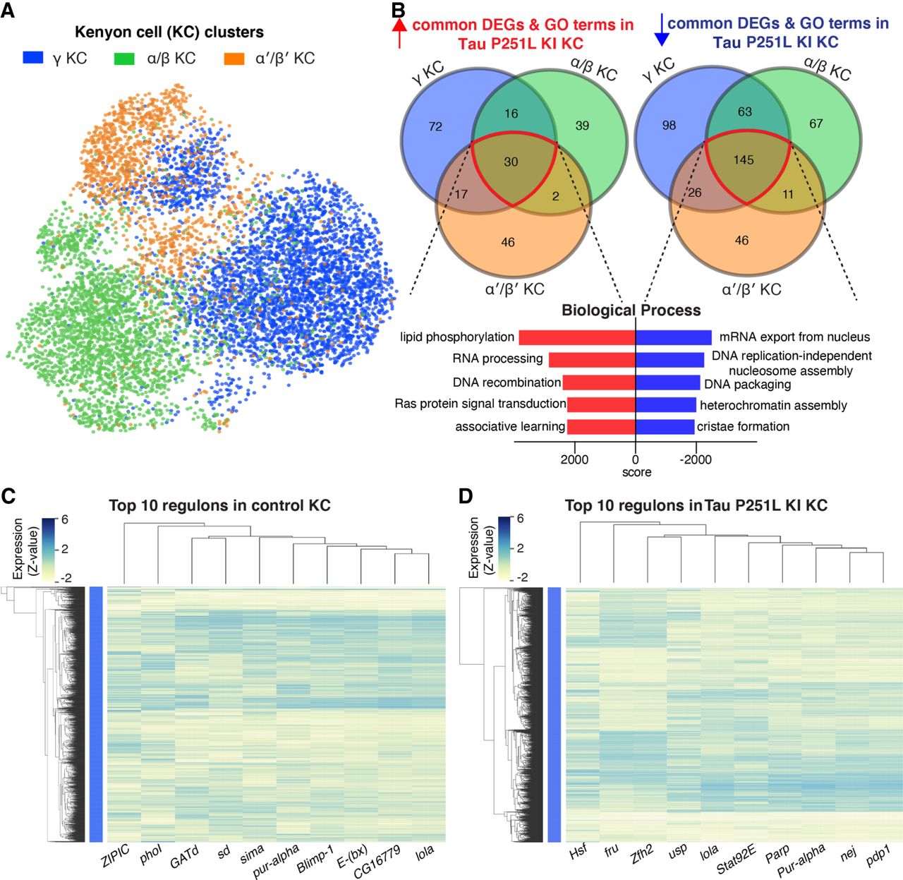 Gene expression and regulatory networks in Kenyon cells (KCs). (A,B) Three KC clusters—gamma-KC, alpha/beta-KC, and alpha′/beta′-KC—and biological process based on the common up-regulated and down-regulated genes in KC clusters in Tau P251L knock-in brains. Score represents the combined score c = log(p) × z (Chen et al. 2013). Control and Tau P251L knock-in Kenyon cells were clustered separately using SCENIC gene regulatory network analysis to identify regulons. (C,D) The top 10 regulons identified by SCENIC gene regulatory network analysis in control (C) and Tau P251L knock-in (D) KCs are presented in the heatmaps. Each row represents a KC; each column is a regulon.