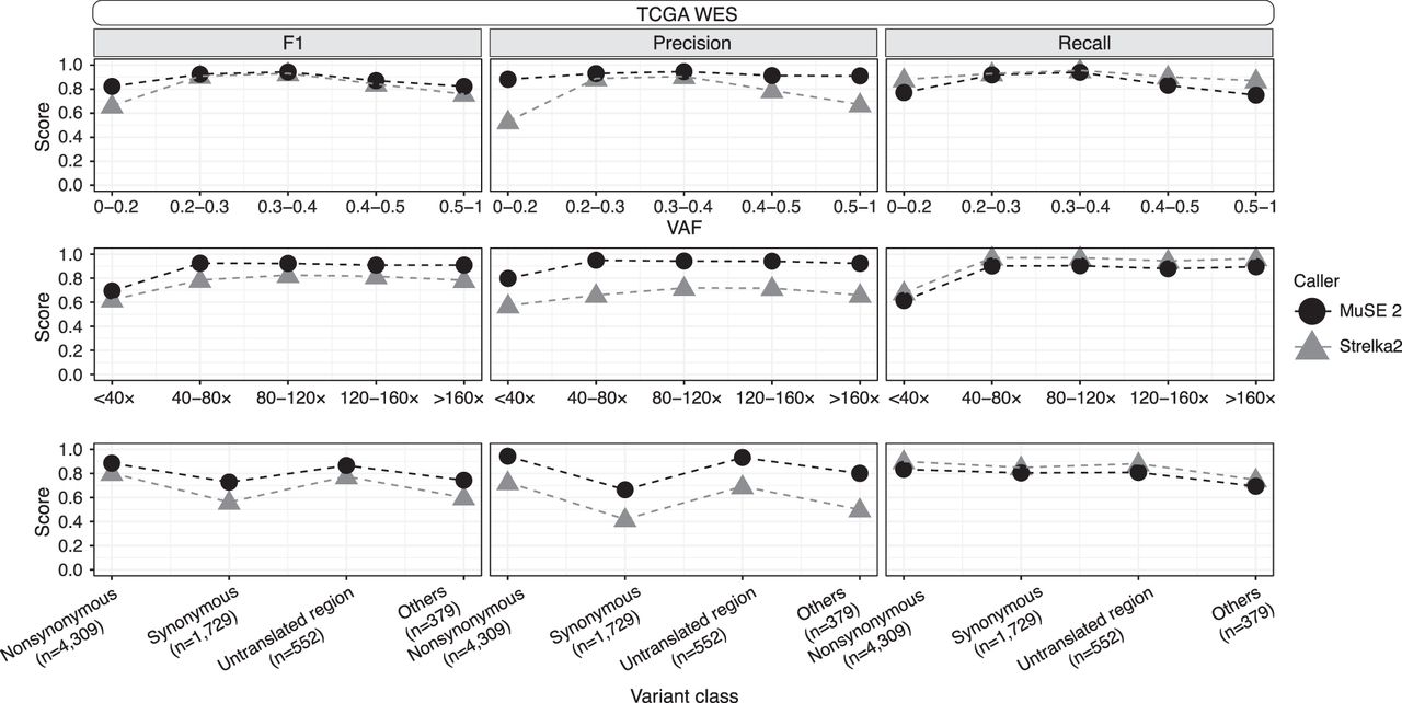 Comparisons of F1 score, precision, and recall between MuSE 2 and Strelka2 within each bin of variant allele frequency (VAF; top), sequencing read depth (middle), or variant class (bottom) for TCGA WES data. The calls of each method and the consensus calls, which are used as the truth set, are pooled from the WES data of five patient samples in TCGA.