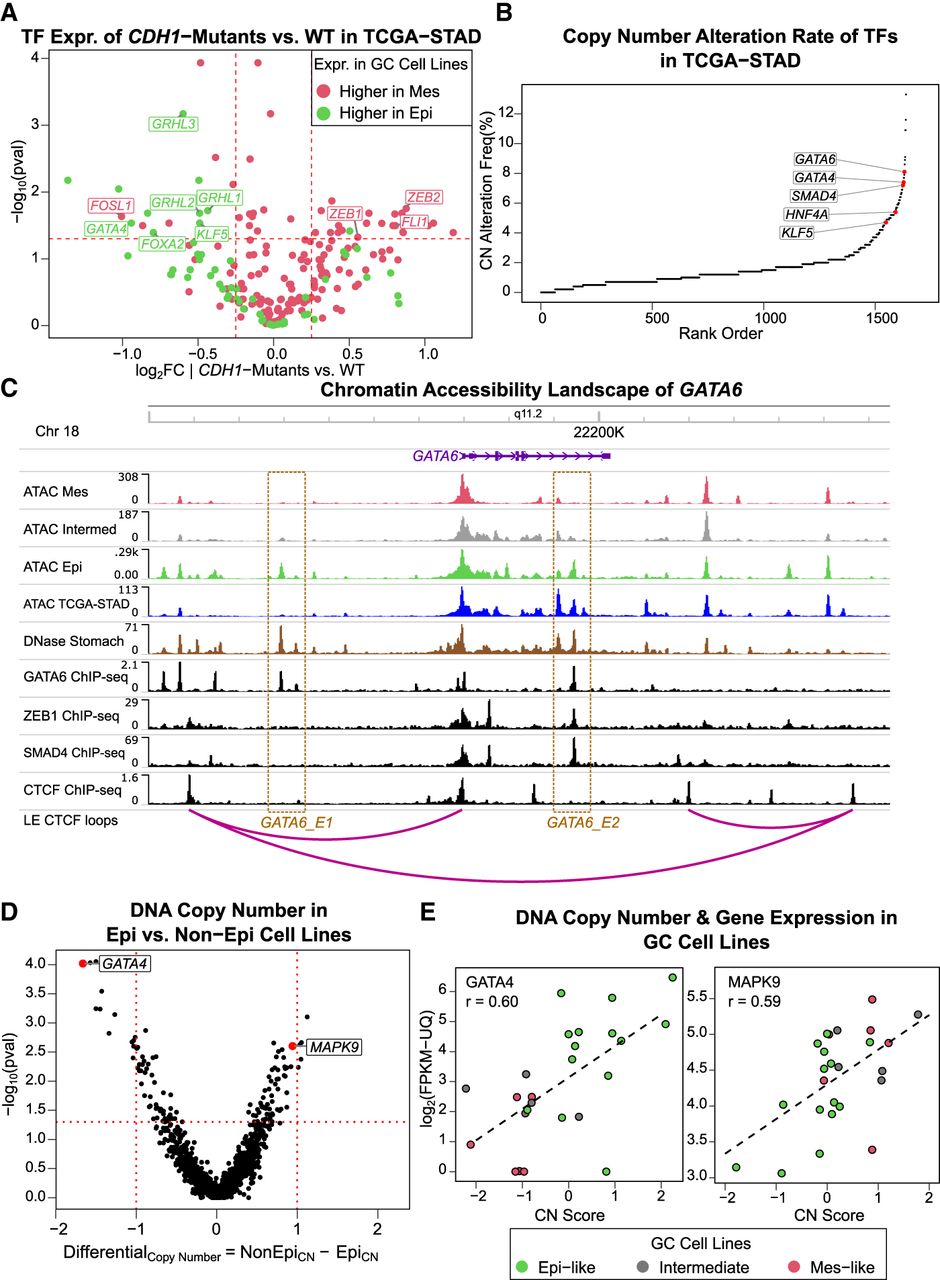 Mutations and copy number (CN) variants are associated with distinct Mes-like and Epi-like TF activation in GC. (A) Nonsynonymous CDH1 mutation status separates TFs with differential expression between Mes-like and Epi-like cell lines. Shown is TCGA-STAD expression in tumors with and without a CDH1 nonsynonymous mutation (t-test P < 0.05 and |log2FC| > 0.25). (B) Human TFs ranked in order of DNA CN alteration rate in TCGA-STAD primary tumors. (C) Chromatin accessibility landscape and TF binding of ZEB1 and SMAD4 in the GATA6 locus. GATA6_E1 and GATA6_E2 are putative Epi-like and normal stomach enhancers, where GATA6 binds in GATA6 ChIP-seq in AGS GC cell line. (D) GATA4 has reduced CN in non-Epi cell lines, and MAPK9 has amplified CN in non-Epi cell lines. Average CN differences between Epi GC cell lines and non-Epi (Mes and Intermediate) GC cell lines are shown for protein-coding genes whose expression and CN correlate. CN values are obtained by DNA sequencing, in which “−2” marks deep DNA deletion, “0” shows a normal diploid genome, and “+2” is for deep DNA amplification in the gene locus. Mann–Whitney U test P < 0.05. (E) CN variation is consistent with altered GATA4 and MAPK9 expression across samples. r is the Pearson's correlation between CN scores and gene expression.