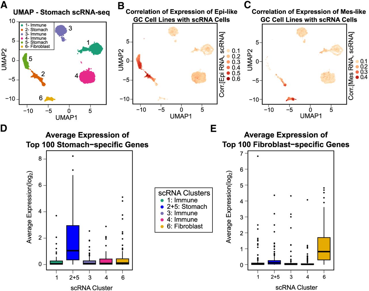 Mes-like GC is most similar in expression profile to the single-cell fibroblast population of both tumor and normal stomach tissue. (A) UMAP of scRNA-seq of gastric tumor and adjacent normal stomach tissue from Kim et al. (2022). Six cell populations are detected; populations 2 and 5 are stomach, and 6 is fibroblast. (B) Epi-like cell line gene expression profiles are most highly correlated with the stomach clusters 2 and 5. (C) Mes-like gene expression profiles are most highly correlated with the fibroblast cluster, cluster 6. (D) Highly expressed stomach-specific genes are expressed only in stomach clusters 2 and 5, combined owing to similarity (t-test P < 10−8 for cluster 2 + 5 vs. other clusters). (E) Highly expressed fibroblast-specific genes are expressed only in fibroblast cluster 6 (t-test P < 10−9 for cluster 6 vs. other clusters).