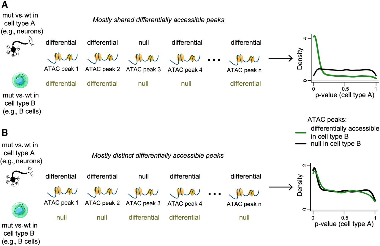 Testing whether disruption of chromatin accessibility preferentially occurs at the same regulatory elements in two cell types using conditional P-value distributions; illustration of the basis of our approach. (A) Hypothetical example of two cell types showing disruption of chromatin accessibility primarily at the same regulatory elements when comparing mutant and wild-type mice in each cell type. There are also some regulatory elements differentially accessible between the mutant and wild type in only one of the two cell types (such as peak 4), but the overlap between the two cell types exceeds what is expected by chance. The resulting distribution of P-values in cell type A, when restricting to regulatory elements that are differentially accessible in cell type B, shows an overrepresentation of P-values close to zero. This overrepresentation is not observed when restricting to regulatory elements that are not differentially accessible in cell type B. (B) Like A, but with different regulatory elements disrupted in cell types. There are also some regulatory elements differentially accessible between the mutant and wild type in both cell types (such as peak 4), but the overlap between the two cell types does not exceed what is expected by chance. The resulting distribution of P-values in cell type A shows the same overrepresentation close to zero regardless of whether we restrict to regulatory elements that are differential in cell type B or regulatory elements that are not differential in cell type B.