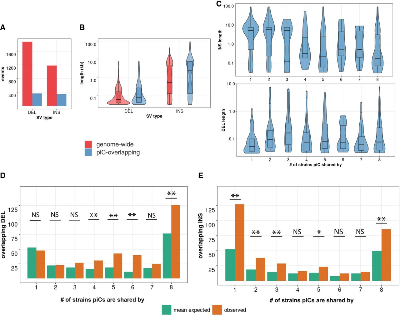 Common piCs show “trap” like sequence turnover. (A) Observed counts of indels genome-wide and overlapping with piCs. (B) Length distribution of indels genome-wide and overlapping with piCs. Significant differences are shown from Kruskal–Wallis test comparisons. (C) Length distribution of indels overlapping piCs grouped by the number of strains they are shared by (i.e., population frequency). (D,E) Enrichment analyses of deletion (DEL) and insertions (INS) variants in piCs performed. Variants overlapping with piCs of differing population frequencies are compared with the expected mean overlap counts genome-wide. Variant calls were shuffled 1000 times. (*) P < 0.05, (**) P < 0.005.