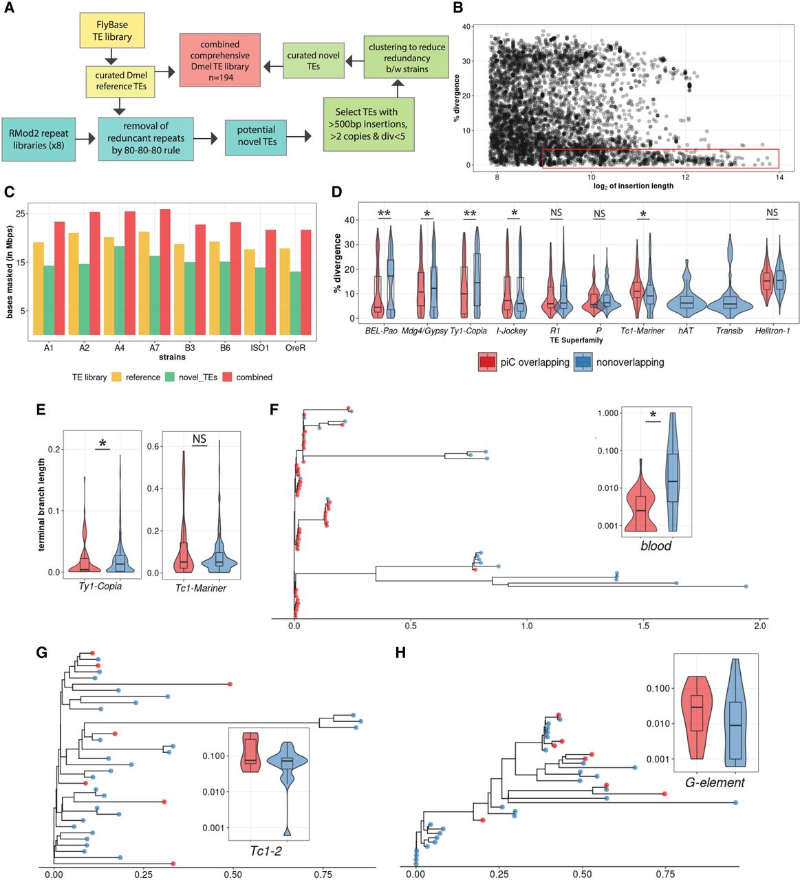 De novo TE annotation uncovers ∼3 Mb of hidden TEs and reveals strong associations of young LTR TEs with piCs more than any other TE subclasses. (A) TE annotation pipeline using RepeatModeler2 and RepeatMasker to create the comprehensive TE library. (B) Abundance of extremely similar and long TE insertions from RepeatMasker output of strain B6 using novel TE consensus library. (C) Differences in million base-pairs (Mbp) masked in RepeatMasker results using novel-only, reference-only, and combined TE library. (D) Divergence estimates for all defragmented iso-1 insertions (>200 bp) from RepeatMasker output. Insertions with >1-bp overlap with master-list iso-1 piCs are considered piC overlapping. Difference between groups is tested by Wilcoxon rank-sum test. (E) Terminal branch length for all iso-1 insertions from Ty1/Copia and Tc1/Mariner superfamilies from maximum likelihood trees. (F–H) Maximum likelihood trees constructed from all defragmented insertions for blood, Tc1-2, and G-element families, and the inset shows terminal branch length quantification. Difference between groups is tested by Wilcoxon rank-sum test: (*) P < 0.05, (**) P < 0.005, (***) P < 0.0005.