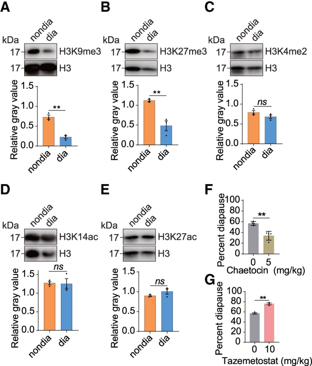 H3K9me3 and H3K27me3 are involved in diapause regulation of O. furnacalis larvae. (A–E) Western blot analysis was conducted on the head of Asian corn borer larvae to detect the levels of H3K9me3, H3K27me3, H3K4me2, H3K14ac, and H3K27ac. The antibody against total H3 was used as the loading control. The relative gray values of western blot were measured using Image J. Statistical differences were measured using an unpaired t-test: (ns) no significant difference, (**) P < 0.01. Error bars show the mean ± SEM. (F) Newly molted fourth instar larvae were fed artificial diets containing 0 mg/kg and 5 mg/kg SUV39H2-like (homologous to SU(VAR3-9) of D. melanogaster) inhibitor chaetocin, respectively. The results showed that chaetocin alleviated diapause caused by adverse environment. Statistical analysis using an unpaired t-test revealed a significant difference: (**) P < 0.01. (G) Similarly, newly molted fourth instar larvae were fed artificial diets containing 0 mg/kg and 10 mg/kg E(Z) inhibitor tazemetostat, which is homologous to E(Z) of D. melanogaster. The results indicated that tazemetostat exacerbated diapause caused by adverse environmental conditions. Statistical analysis using an unpaired t-test revealed a significant difference: (**) P < 0.01. Each point on the bar graph represents the value of an independent replicate.