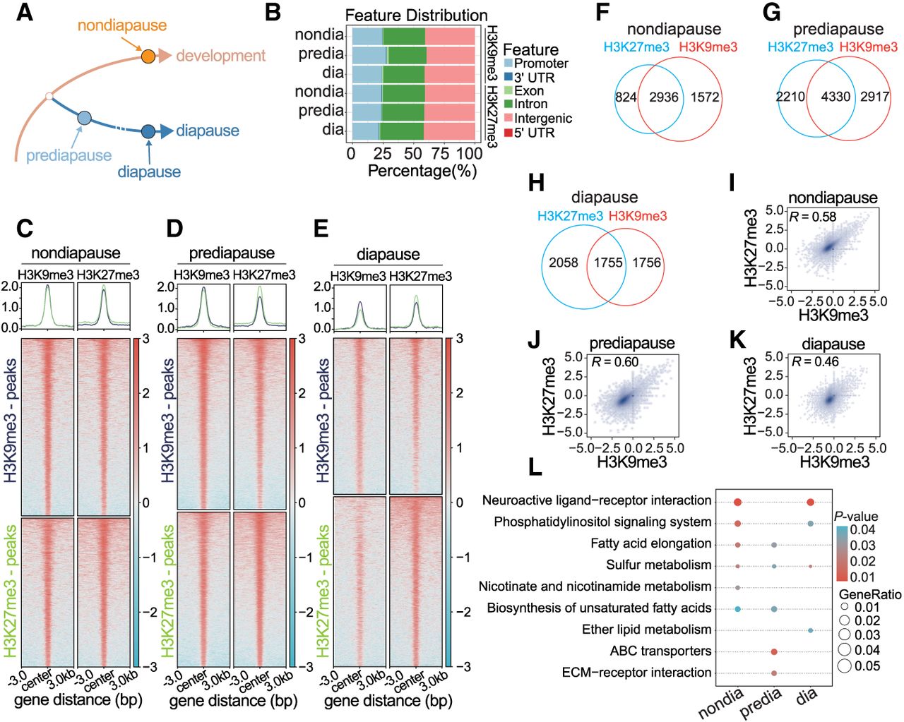 Positive correlation between H3K9me3 and H3K27me3 during different diapause stages. (A) ChIP-seq experimental design. (B) Distribution of H3K9me3 and H3K27me3 peaks across the annotated genome. (C–E) Overlapping peaks of H3K9me3 and H3K27me3 in the nondiapause (C), prediapause (D), and diapause (E) stages. (F–H) Venn diagram shows the number of genes with H3K9me3 peaks, H3K27me3 peaks, or both at the nondiapause (F), prediapause (G), and diapause (H) stages. (I–K) Genome-wide correlation plots showing correlation of the occupancies of H3K9me3 and H3K27me3 at the nondiapause (I), prediapause (J), and diapause (K) stages. The correlation coefficient R is indicated. (L) Comparative KEGG enrichment analysis of comodified genes in the nondiapause, prediapause, and diapause stages. The color shade of the dots represents the P-value, and the size of the dots represents the gene enrichment ratio.