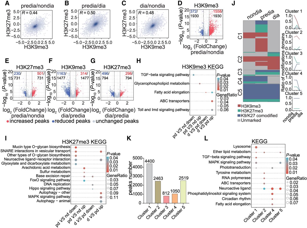 Global features of H3K9me3 and H3K27me3 modifications during diapause of Asian corn borer larvae. (A) Genome-wide correlation plots of H3K9me3 and H3K27me3 occupancies changed between the prediapause and nondiapause stages, respectively. (B) Genome-wide correlation plots of H3K9me3 and H3K27me3 occupancies changed between the prediapause and diapause stages, respectively. (C) Genome-wide correlation plots of H3K9me3 and H3K27me3 occupancies changed between the diapause and nondiapause stages, respectively. (D–G) Volcano plot of genes with statistically significant differential H3K9me3 and H3K27me3 peaks between different diapause stages. (H) Comparative KEGG enrichment analysis of genes with statistically significant differential H3K9me3 peaks. (I) Comparative KEGG enrichment analysis of genes with statistically significant differential H3K27me3 peaks. (J) Heatmaps showing the clustering of genes with H3K9me3, H3K27me3, or H3K9me3/H3K27me3 comodifications in the nondiapause, prediapause, and diapause stages (left panel). The ratios of H3K9me3, H3K27me3, and H3K9me3/H3K27me3 comodified genes are shown (right panel). Red indicates the domains that are marked only by H3K9me3; green, domains that are marked only by H3K27me3; blue, H3K9me3/H3K27me3 comodified domains; and gray, unmarked domains. (K) The number of peaks in each cluster in panel J. (L) Comparative KEGG enrichment analysis of genes in different clusters in panel J.