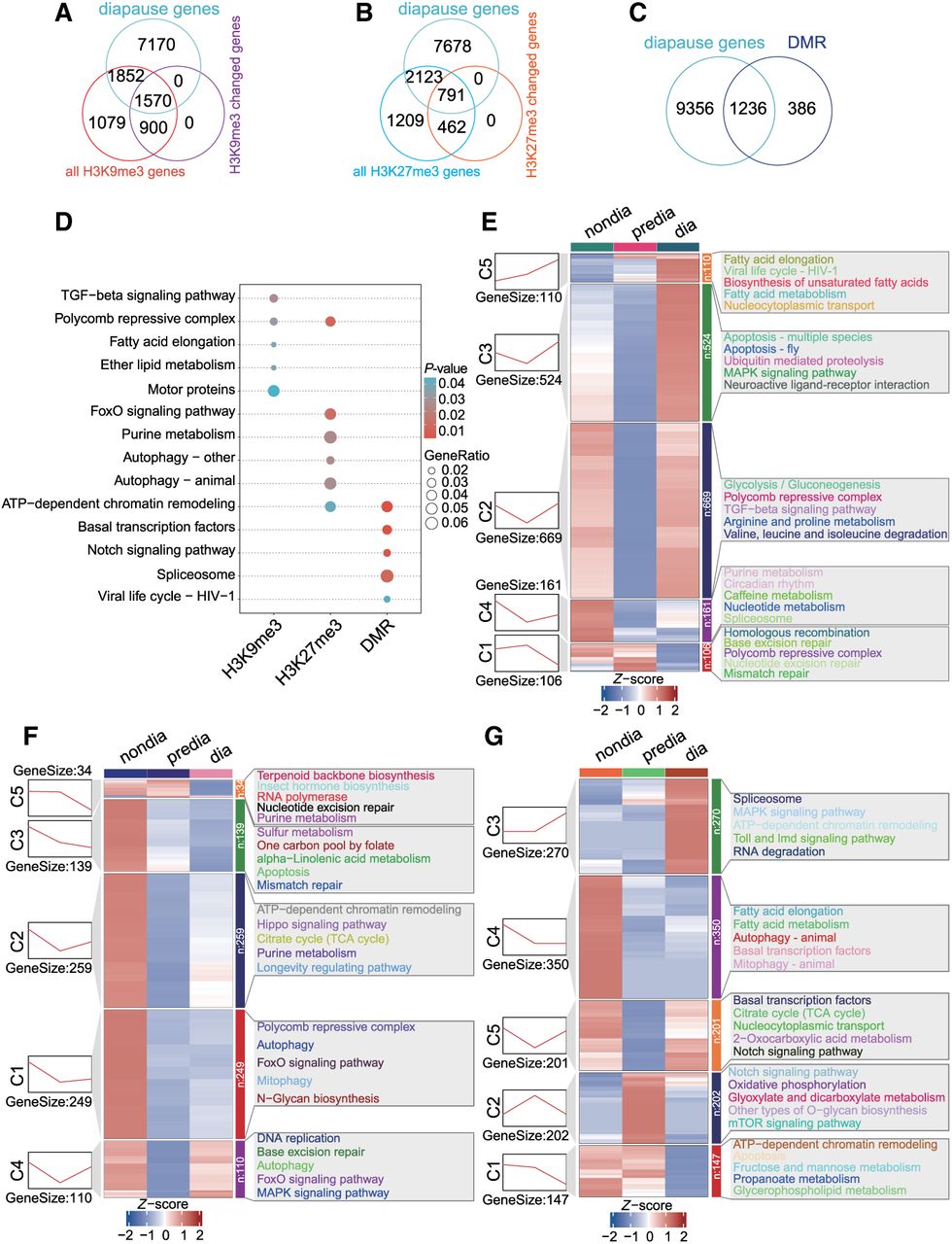 Clustering of the epigenetically modified genes known to be important for diapause regulation. (A–C) The Venn diagram illustrates the number of overlapping genes between the known diapause-regulating gene number and the gene numbers epigenetically modified by H3K9me3 (A), H3K27me3 (B), and DNA methylation (C), with or without changes during diapause, respectively. (D) Comparative KEGG enrichment analysis of the overlapping genes shown in panels A–C for H3K9me3, H3K27me3, and DNA methylation, respectively. (E–G) Clustering of the overlapping genes shown in panels A–C for H3K9me3 (E), H3K27me3 (F), and DNA methylation (G), respectively. Heatmaps show the genes with statistically significant changes (clustered by k-means). The line displays the overall changes in genes in each cluster (left). The KEGG enrichment of genes of clusters is shown on the right panel.