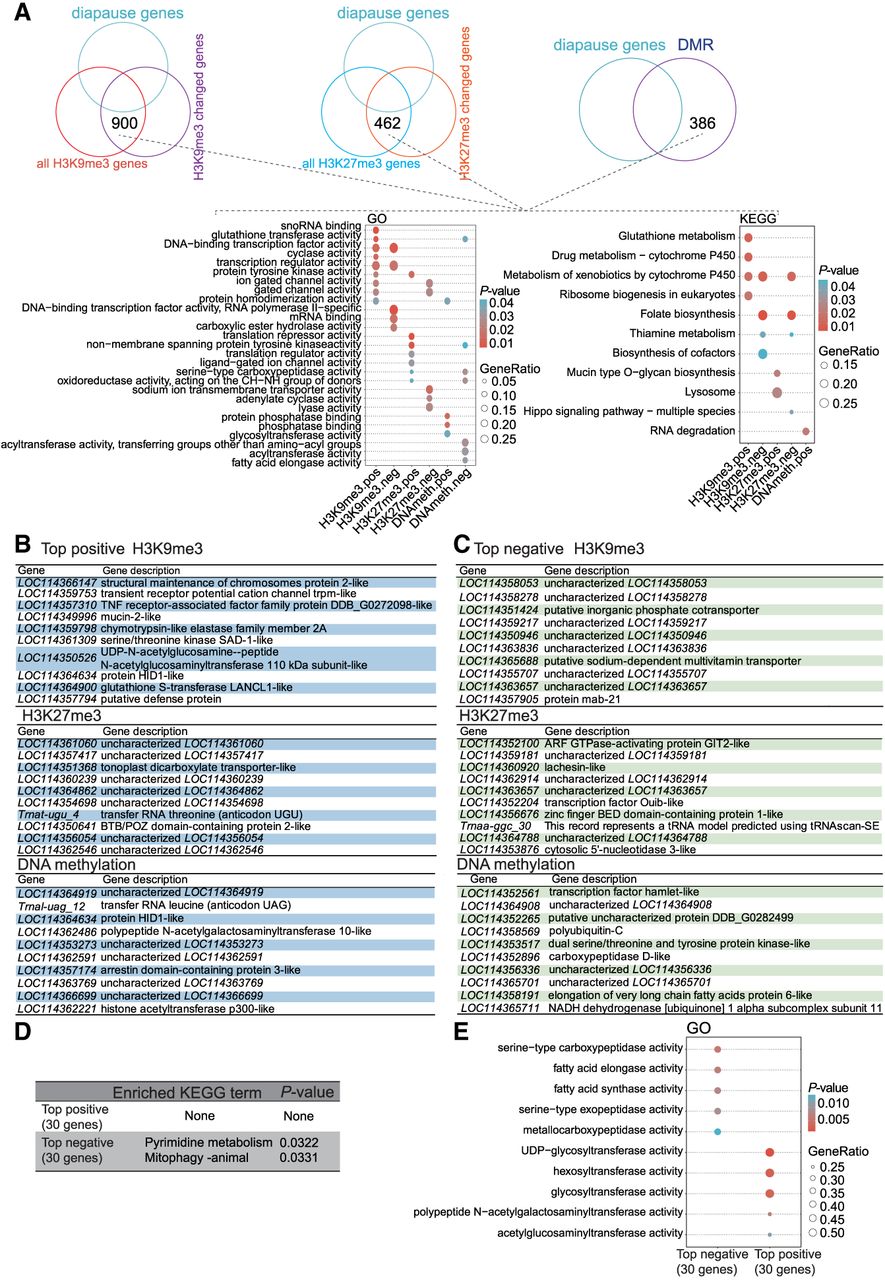 Analysis of previously unreported gene profiles in diapause reveals potential new regulators for diapause. (A) Comparative GO enrichment analysis and comparative KEGG enrichment analysis for the overlapping gene group shown in the upper panel (cf. with Fig. 6A–C) for H3K9me3, H3K27me3, and DNA methylation, respectively. (B,C) The top positive and top negative gene lists from the gene group indicated at the top of panel A. (D) Comparative KEGG enrichment analysis of the top positive and top negative genes. (E) Comparative GO enrichment analysis of the top positive and top negative genes.