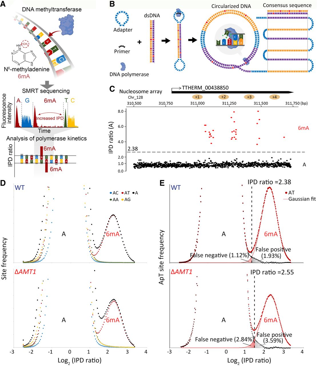 Exclusive methylation at the ApT dinucleotide in Tetrahymena. (A) Overview of 6mA detection by SMRT sequencing. (B) A schematic diagram for SMRT CCS. (C) IPD ratios (IPDr) for all A sites in a typical SMRT CCS read mapped to the Tetrahymena MAC reference genome. The IPDr threshold was set at 2.38, separating 6mA from unmodified A. Note the localization of 6mA clusters in linker DNA between the canonical nucleosome array within the gene body. (D) IPDr distributions (log2) of all A sites in wild-type (WT) (top) and ΔAMT1 cells (bottom). Also plotted were distributions for A sites at the ApA, ApC, ApG, and ApT dinucleotide, respectively. (E) Deconvolution of the 6mA peak and the unmodified A peak for IPDr distributions (log2) at the ApT dinucleotide. Note the low false positive and false negative rates of 6mA calling in WT (top) and ΔAMT1 cells (bottom).