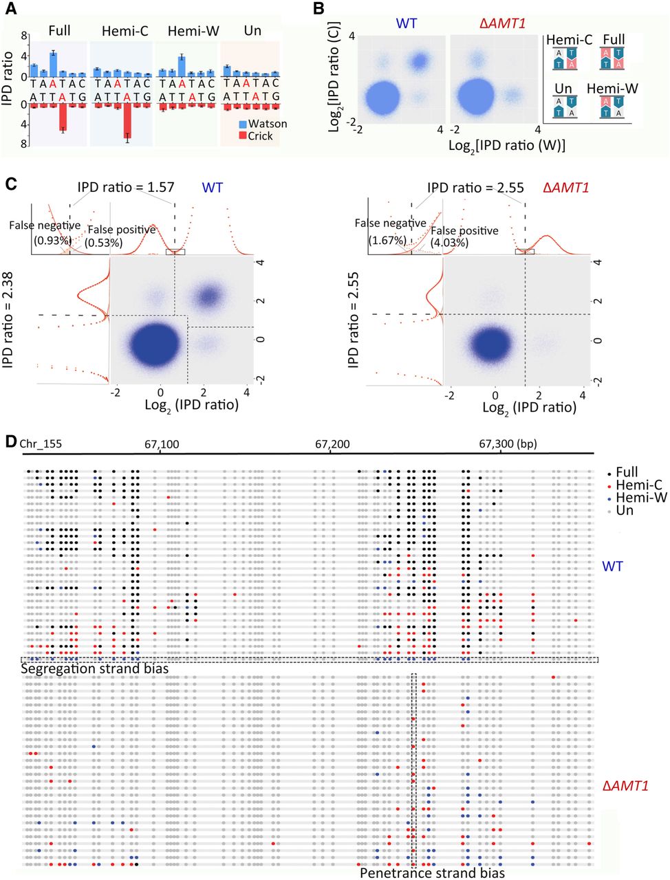 Distinguishing hemi- and full-6mApT. (A) Four states of ApT duplexes: full methylation, hemi-W, hemi-C, and unmethylated, distinguished by IPDr of adenine sites on W and C, respectively. (B) Distribution of ApT duplexes according to IPDr of adenine sites on W and C, respectively. Note the abundance of the full methylation state in WT and its absence in ΔAMT1 cells. (C) Demarcation of the four methylation states of ApT duplexes in WT (left) and ΔAMT1 cells (right) by their IPDr on W and C, respectively. (Left) For bulk ApT duplexes, the IPDr threshold for 6mA calling was set at 2.38, according to deconvolution based on Gaussian fitting of the small 6mA peak. For ApT duplexes with one 6mA as defined above, the IPDr threshold for calling 6mA on the opposite strand was set at 1.57, according to deconvolution based on Gaussian fitting of the small unmodified A peak. (Right) For bulk ApT duplexes, the IPDr threshold for 6mA calling was set at 2.55, according to deconvolution based on Gaussian fitting of the small 6mA peak. For ApT duplexes with one 6mA as defined above, the IPDr threshold for calling 6mA on the opposite strand was also set at 2.55, according to deconvolution based on Gaussian fitting of the small 6mA peak. (D) Typical DNA molecules from Tetrahymena WT (top) and ΔAMT1 cells (bottom). Note ApT duplexes with distinct methylation states (colored dots) distributed along individual DNA molecules (gray line). A DNA molecule with strong segregation strand bias in WT cells and a genomic position with strong penetrance strand bias in ΔAMT1 cells were marked.