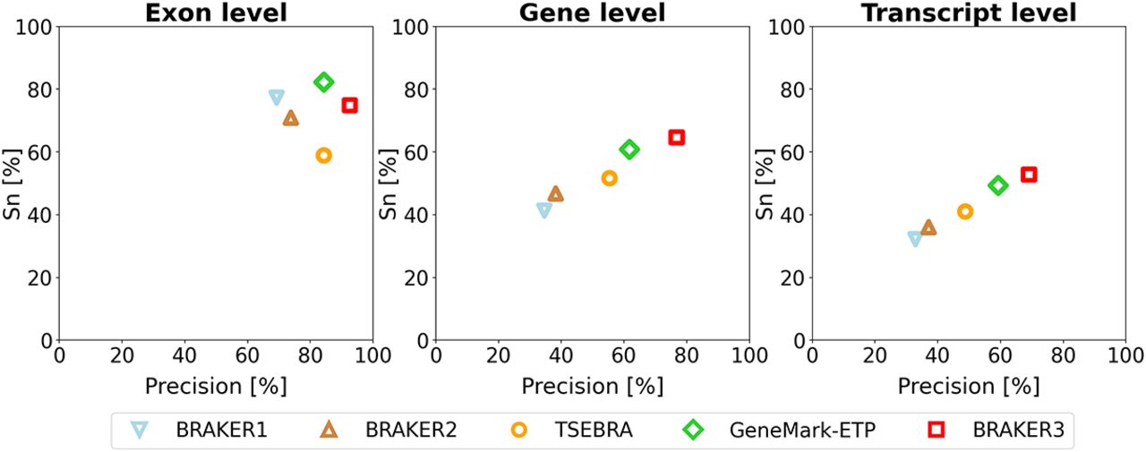 Average precision and sensitivity of gene predictions made by BRAKER1, BRAKER2, TSEBRA, GeneMark-ETP, and BRAKER3 for the genomes of 11 different species (listed in Supplemental Table S1). Inputs were the genomic sequences, short-read RNA-seq libraries, and protein databases (order excluded).